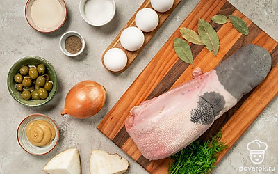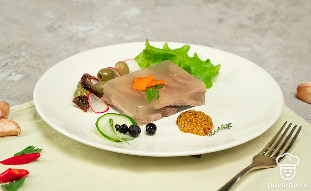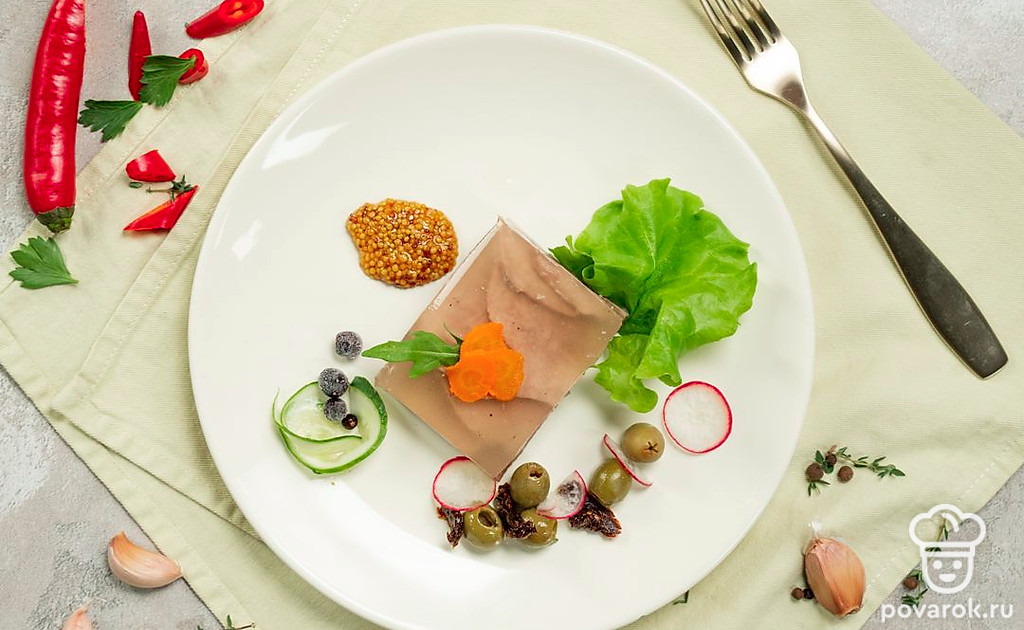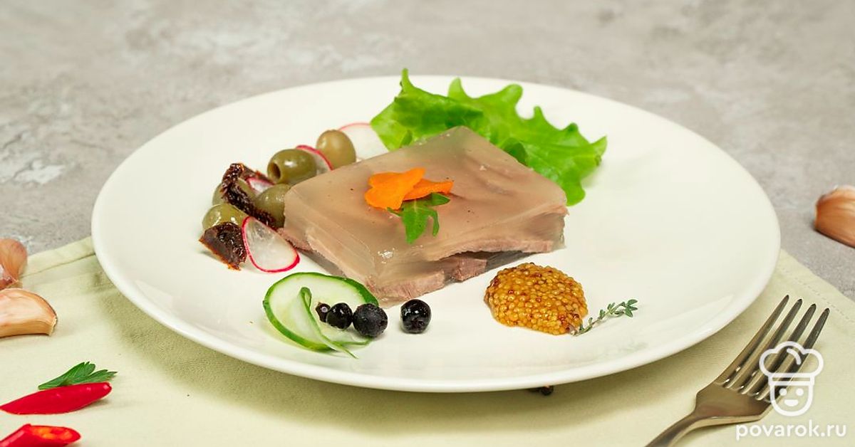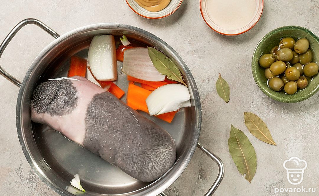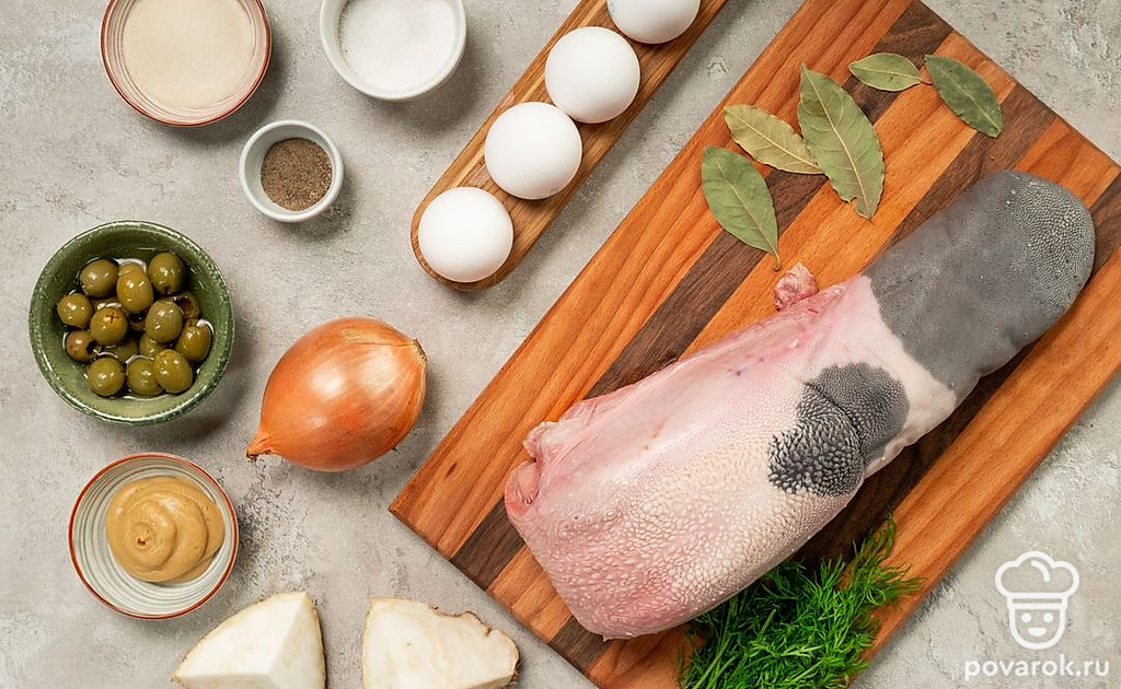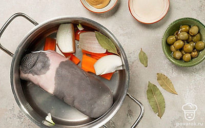 Заливное из языка готовится с добавлением желатина, т.к. сам по себе язык не даст бульона нужной насыщенности. Можно сварить бульон из куриных ног и использовать его в качестве добавки. Язык должен быть фиолетового оттенка, упругим и твердым, при надавливании быстро восстанавливать форму. Выбирайте субпродукты со штампом санитарной службы, который подтверждает, что животное не болело.