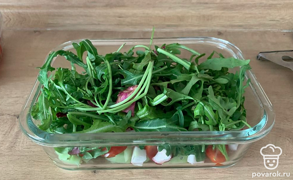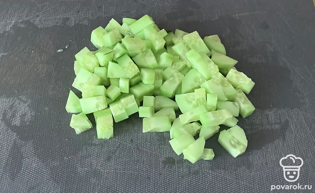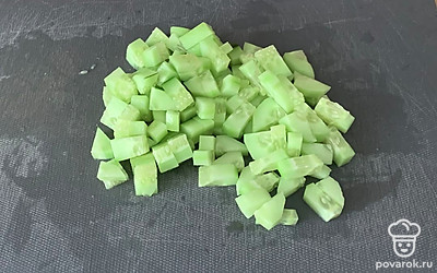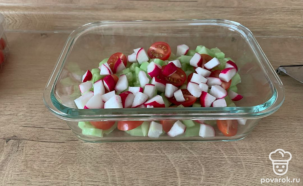 Нарежьте редис кубиками и выложите в миску к огурцам и черри.