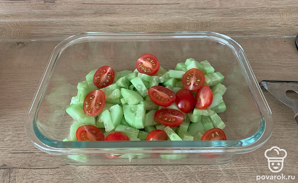 Разрежьте пополам помидоры черри и отправьте их к огурцам.