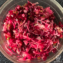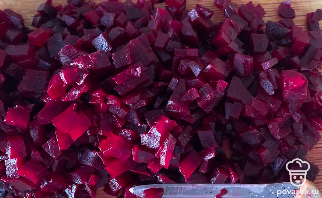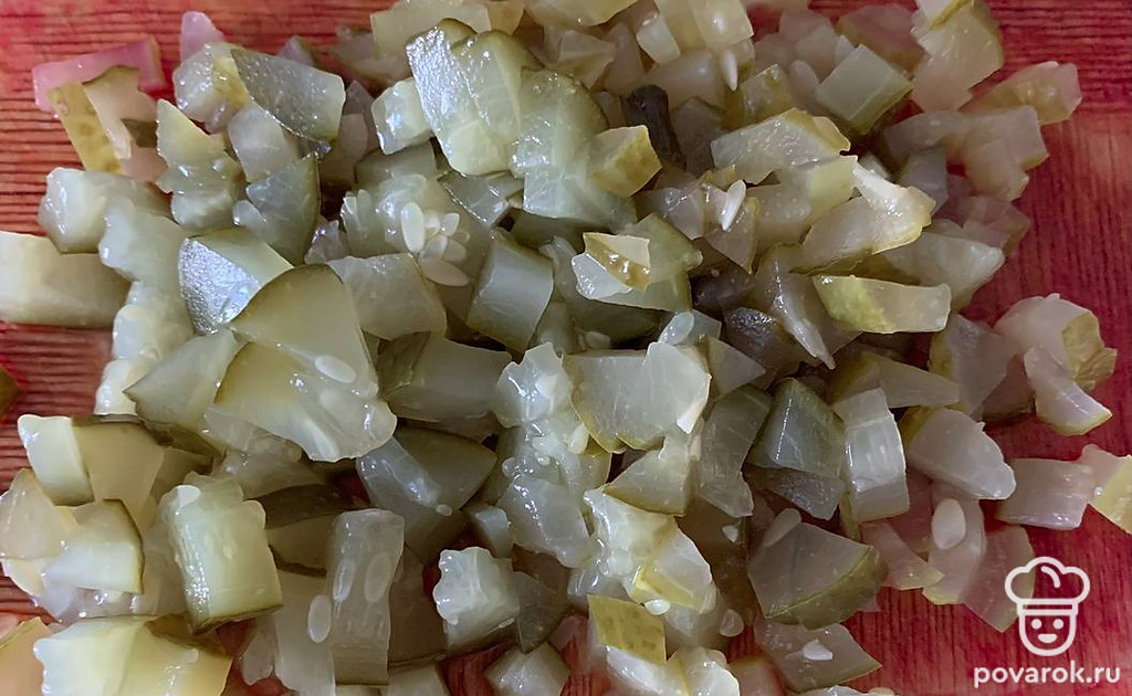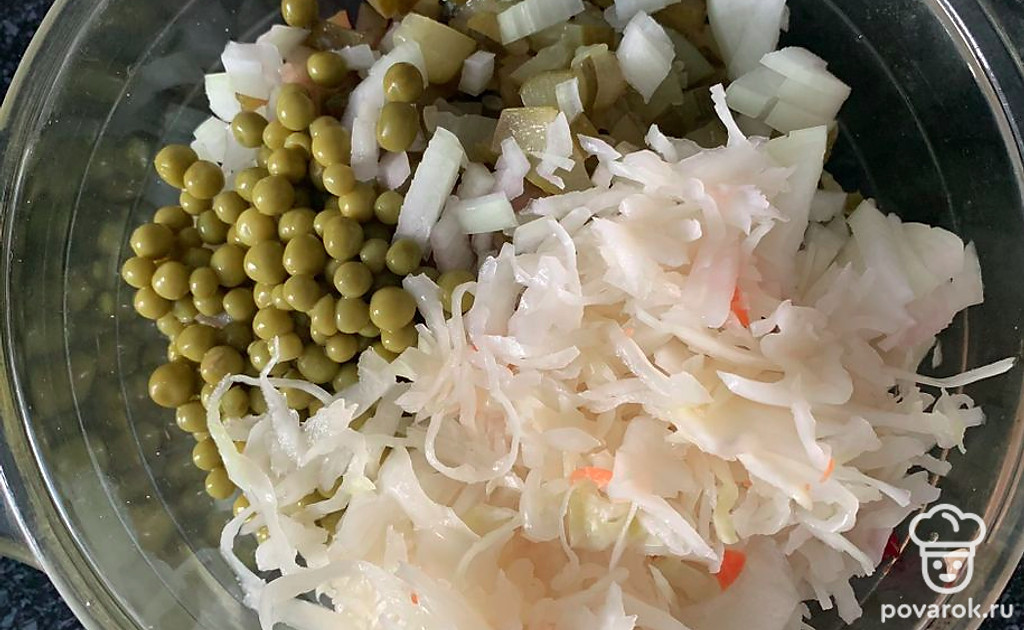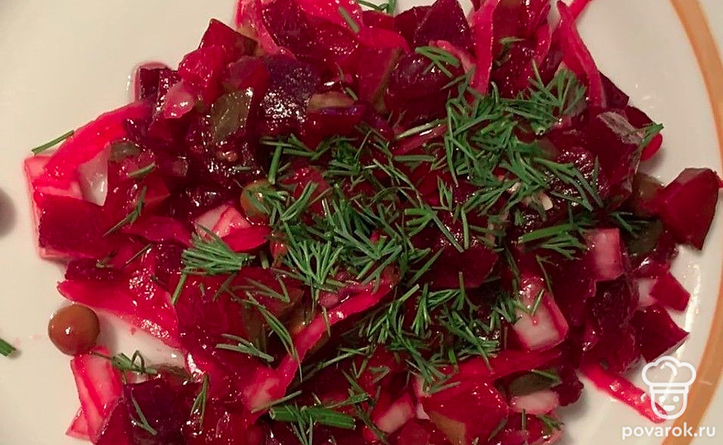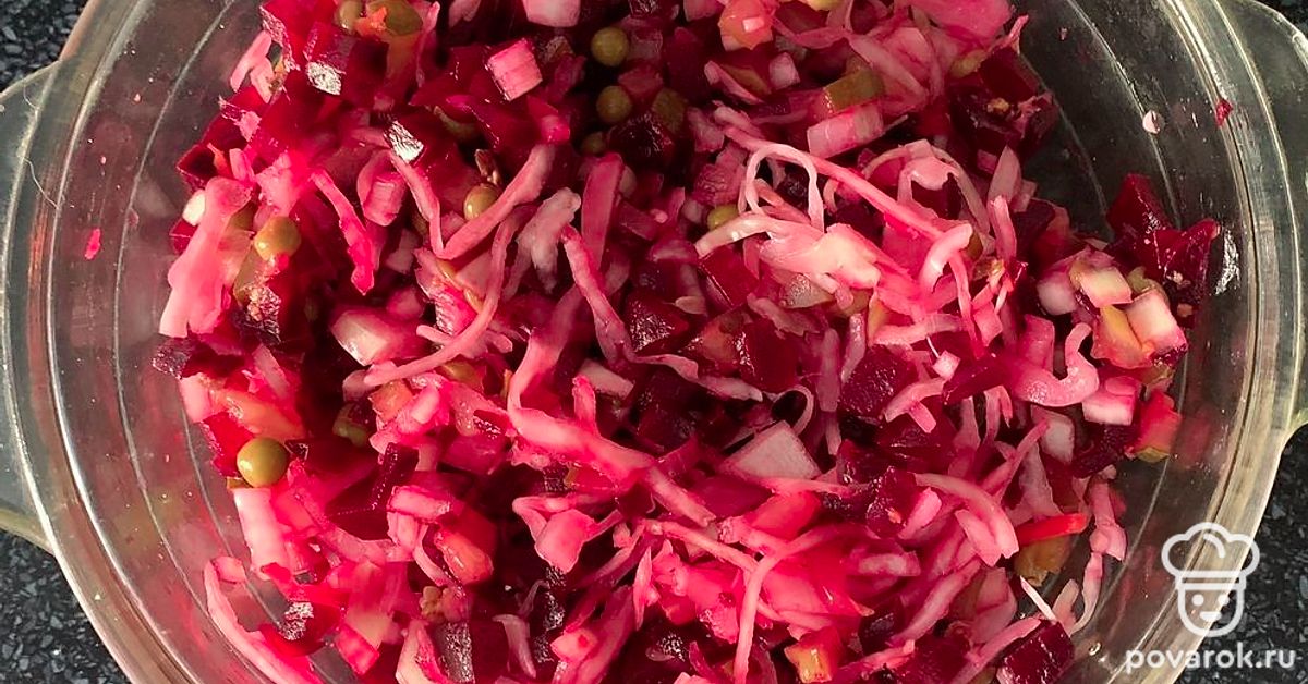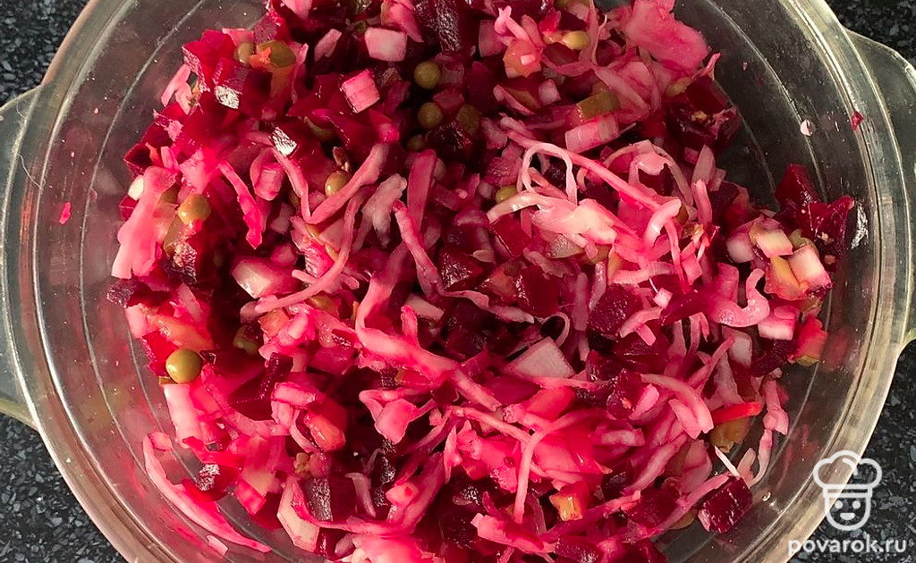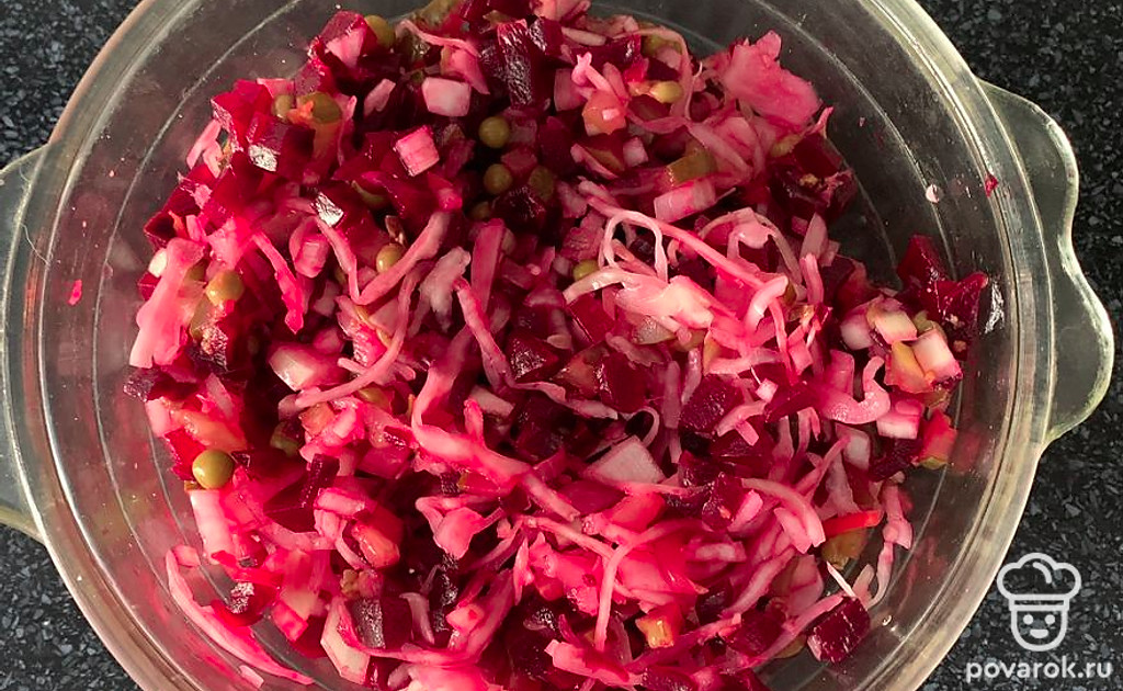 Перемешайте, посолите. Салат готов. Отправьте его ненадолго в холодильник. Заправьте блюдо подсолнечным маслом.