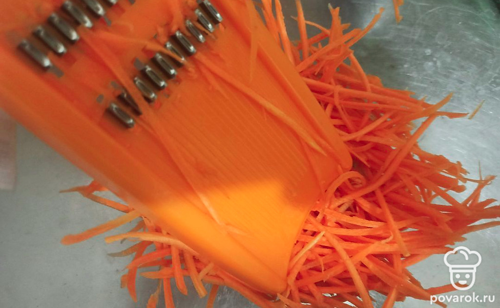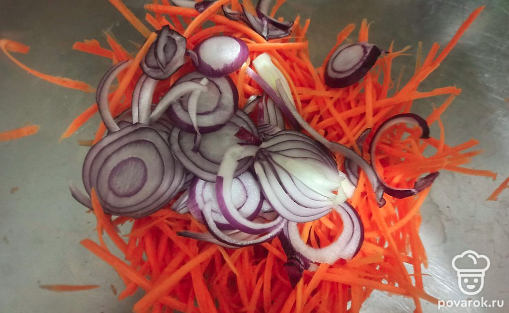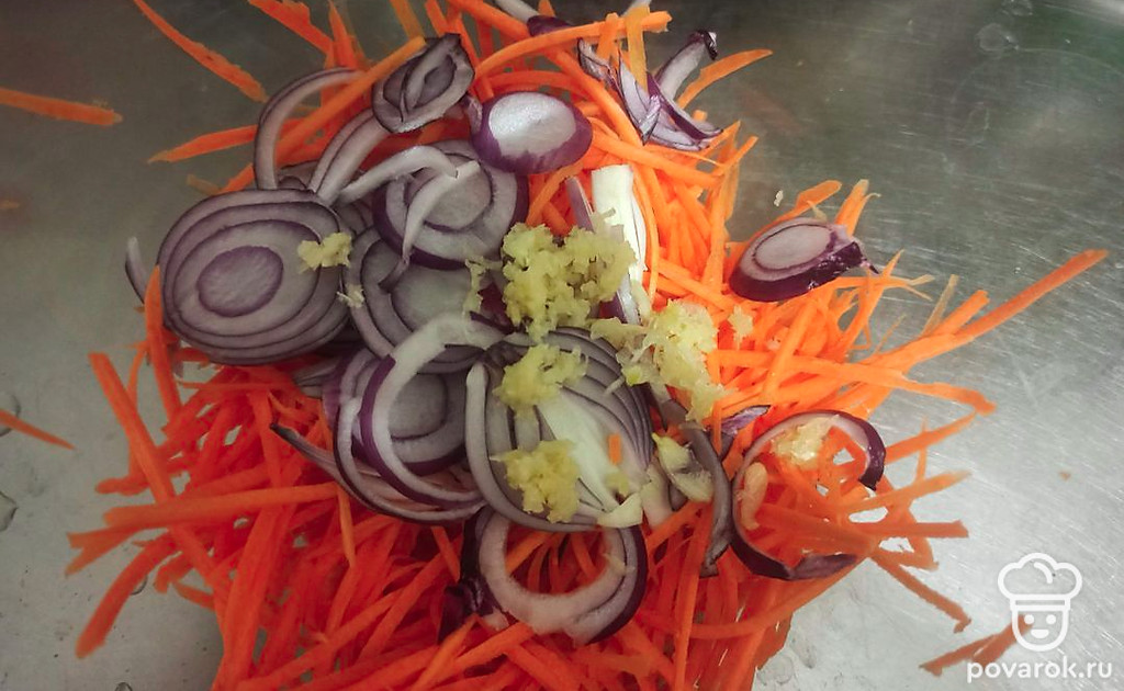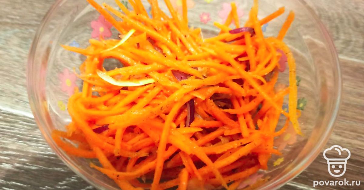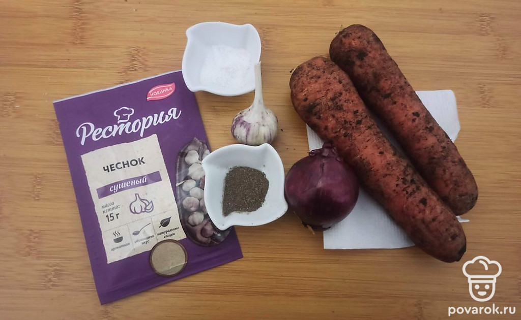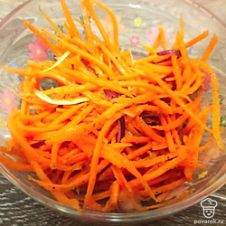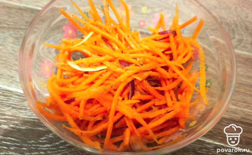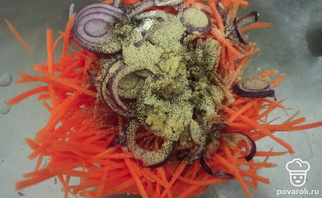Добавьте соль, сушеный чеснок, перец. Хорошо перемешайте салат руками. Морковь помните руками, чтобы она стала мягкой и пустила сок. Дайте салату настояться 40 минут, чтобы он хорошо пропитался.