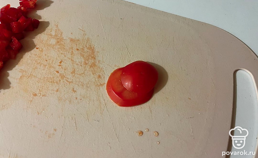Помидор нашинкуйте ломтиками также весом 25 грамм.