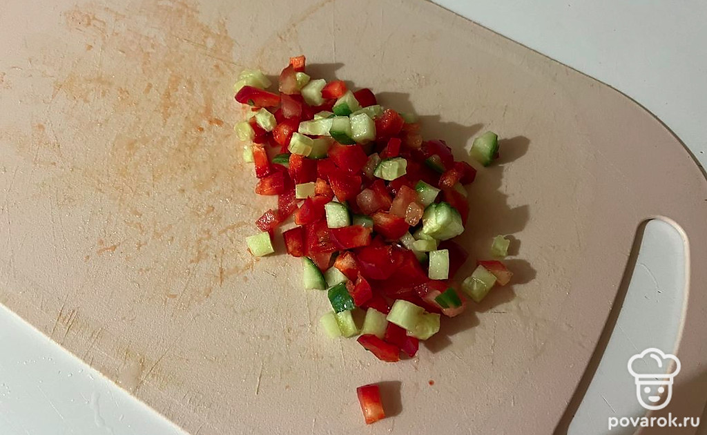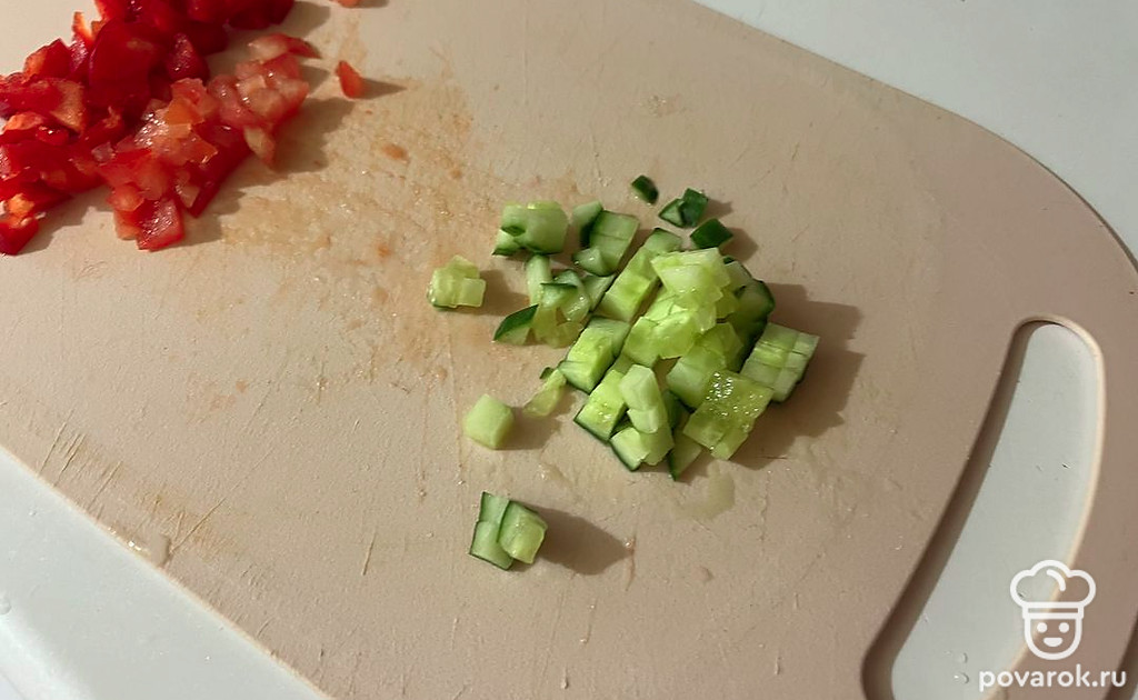 Огурец также измельчите кубиком. Все кубики овощей должны быть примерно одного размера.