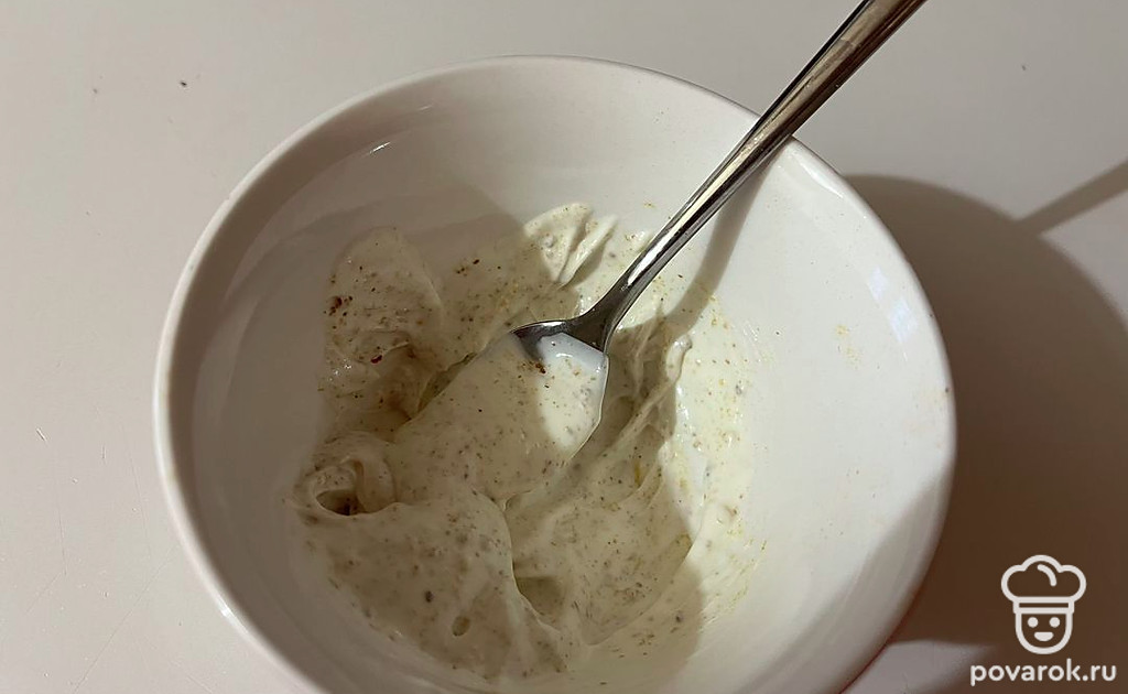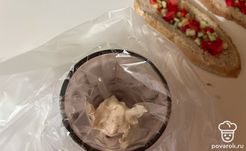 Приготовленный сметанный соус поместите в кондитерский мешок. Угол мешочка надрежьте.