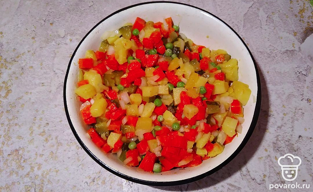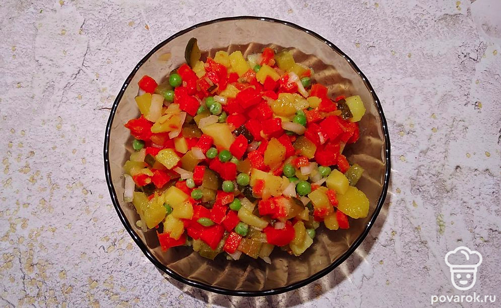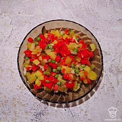 Все мелко нарезаем кубиками, кладем в одну миску. Добавляем щепотку морской соли, смесь перцев и каплю подсолнечного масла холодного отжима.
