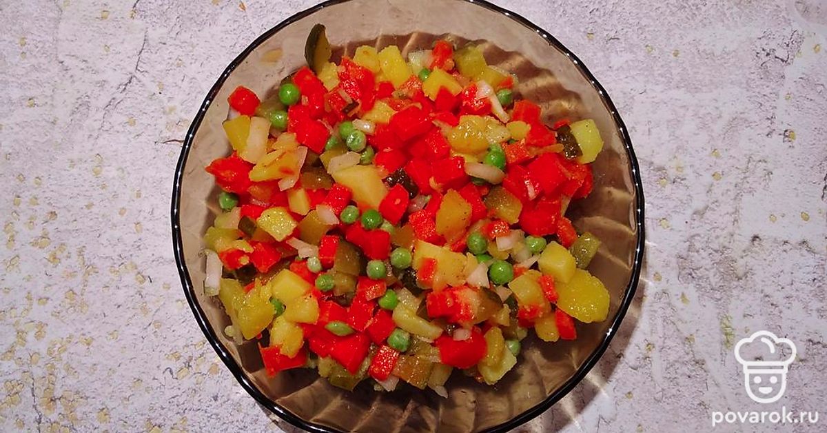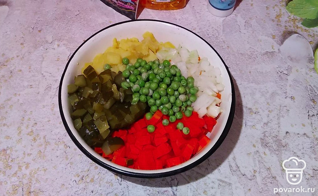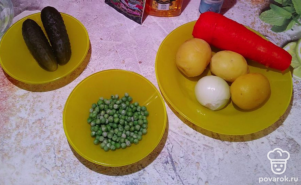 Достаем два соленых огурца. Размораживаем зеленый горошек, промыв его под горячей водой. Чистим лук, три сваренных картошки и морковь.