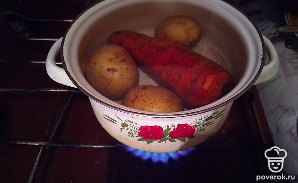 Ставим варить три картошки в мундире и одну морковь на 25 минут. Затем сливаем воду, заливаем их холодной водой.