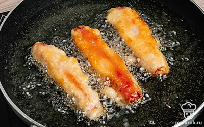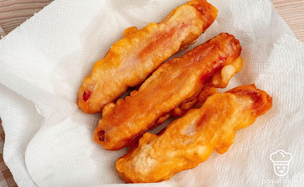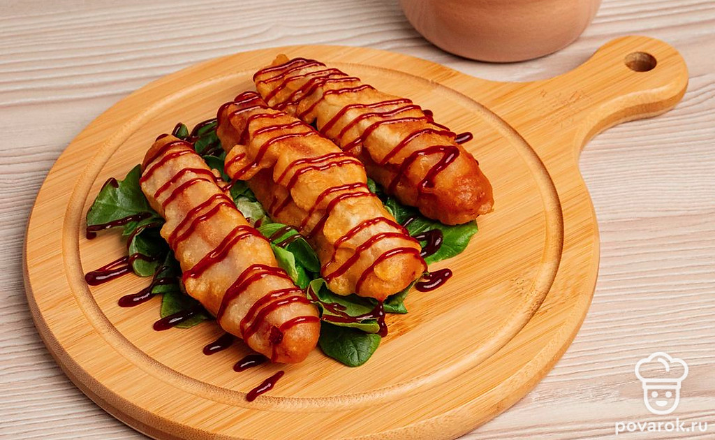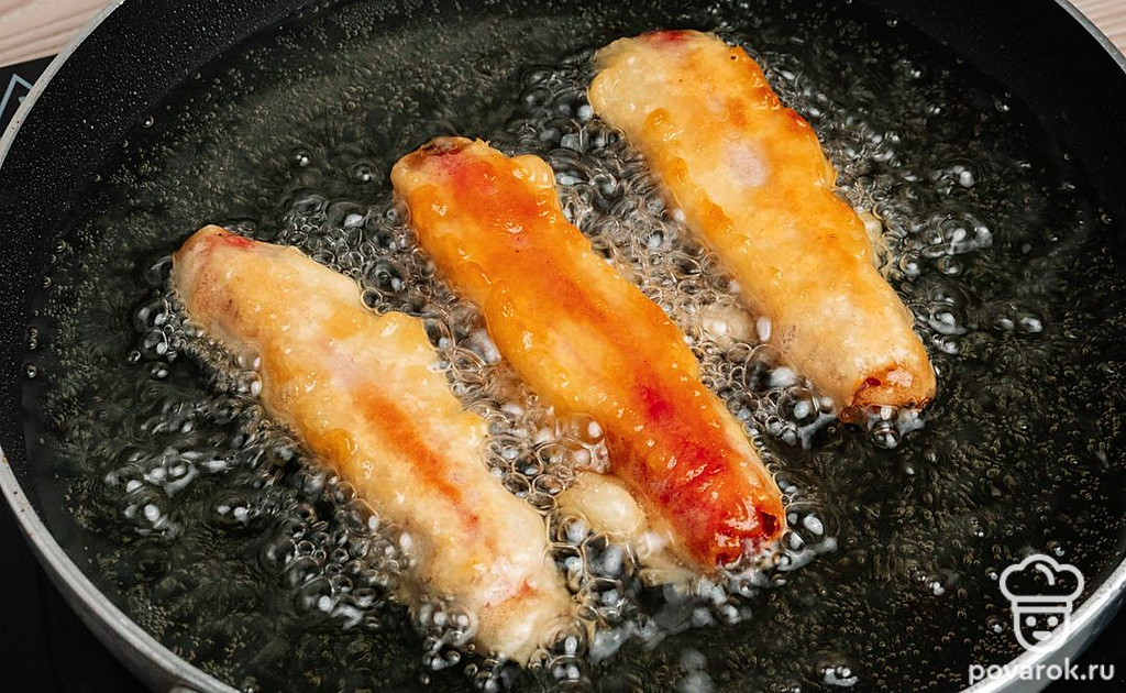 Самым известным аналогом американского хот-дога является сосиска в тесте. Их можно приготовить в разы быстрее, не запекая в духовке! Чтобы сосиски получились в хрустящей золотистой корочке, обваляйте их в муке, опустите в мучную воду и обжарьте. Жареные сосиски в тесте получаются очень сытными и сочными. Перед употреблением положите их на бумажные салфетки. Они впитают лишнее масло после обжарки. Подавайте жареные сосиски с любым соусом. Особенно хорошо подойдут томатный кетчуп или горчица!