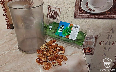 В чаше блендера соединяем орехи, кинзу, масло и яблочный уксус.