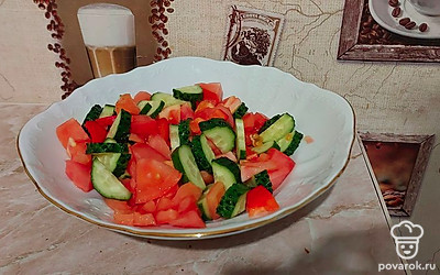 В салатник нарезаем огурцы, помидоры и перец.