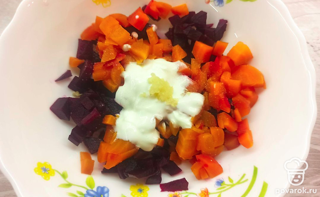 Выложите морковь и свеклу в чашу для салата. Заправьте сметаной, измельчите чеснок и перемешайте. Посолите по вкусу.