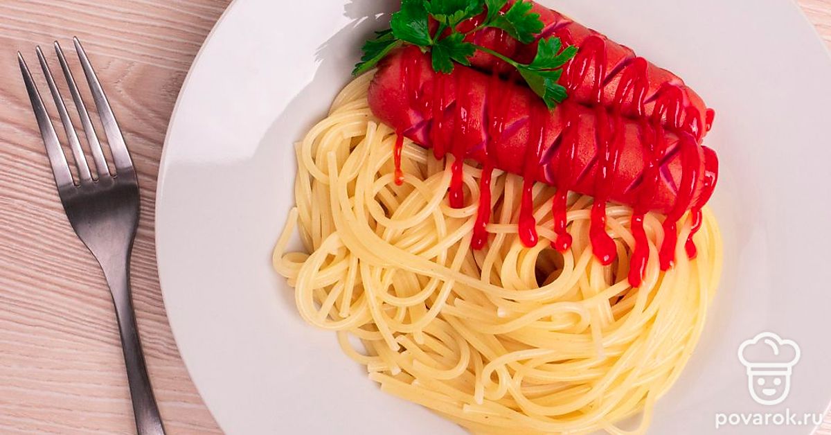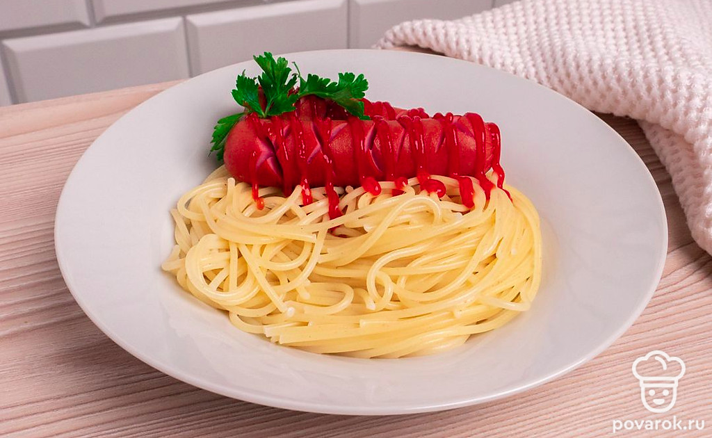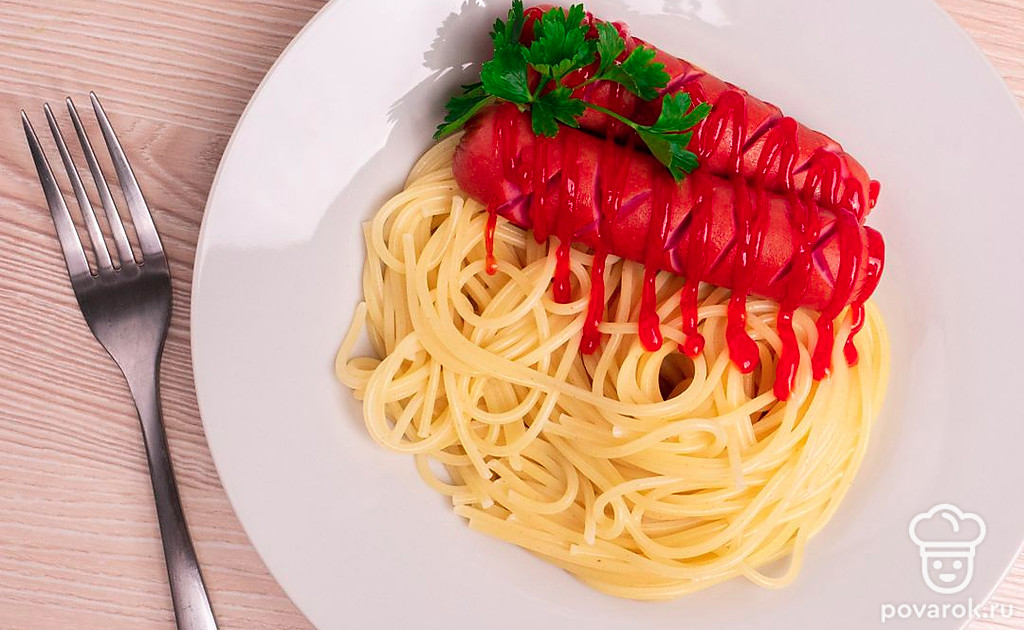 Сосиски со спагетти — традиционное сочетание этих двух ингредиентов, которое чаще всего готовят на ужин. Это блюдо пользуется популярностью не только среди студентов, но и в обычных семьях. Чаще всего их готовят в том случае, когда на приготовление сложных блюд нет времени или сил, ведь для сосисок достаточно просто их отварить или обжарить на сковороде. Спагетти с сосисками можно подать с кетчупом. Этот соус сделает вкус блюда насыщенным, а также благоприятно повлияет на вкусовые рецепторы.
