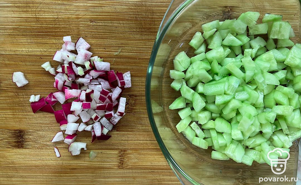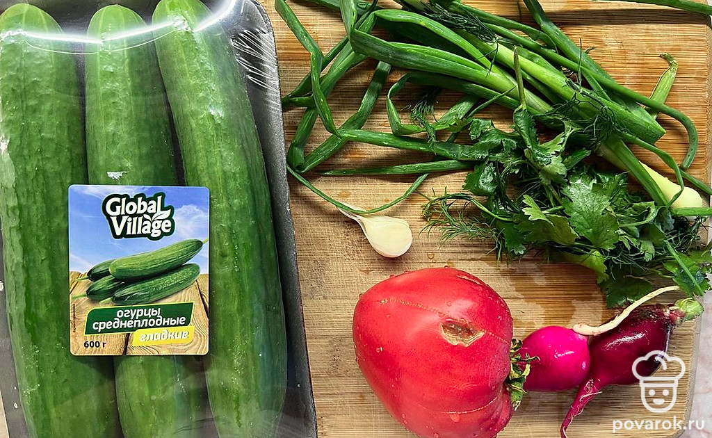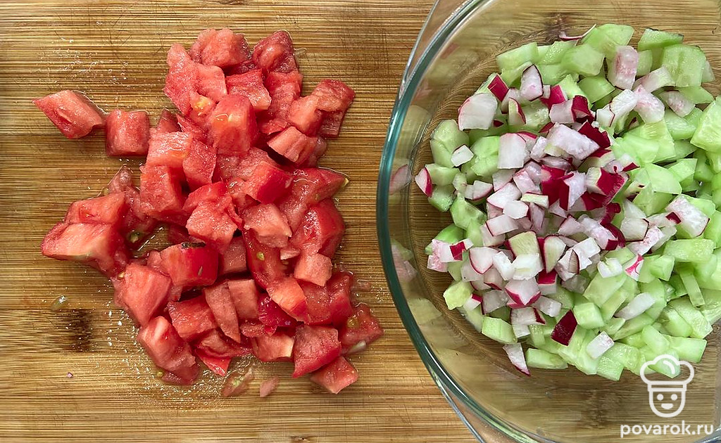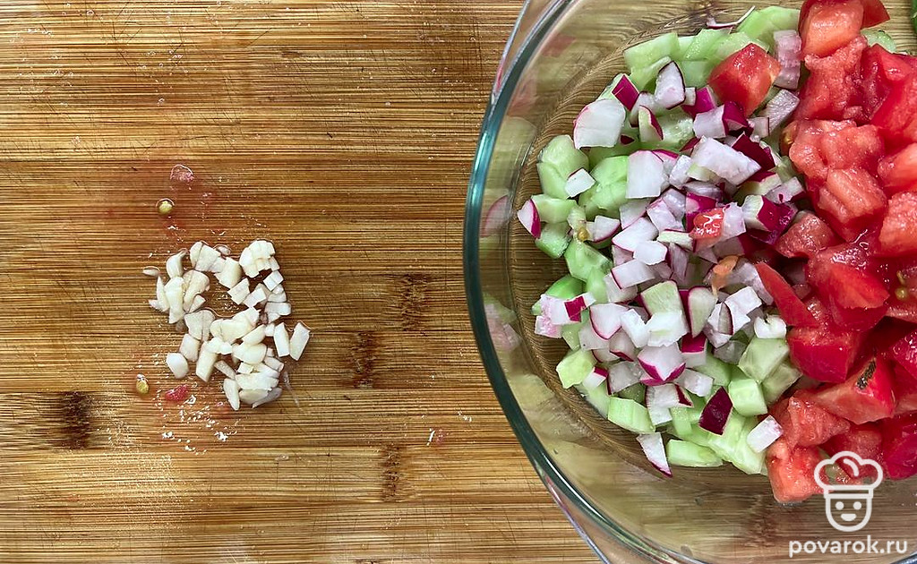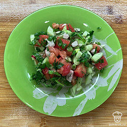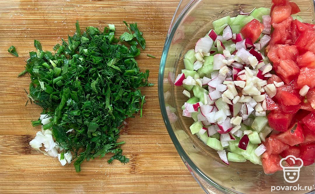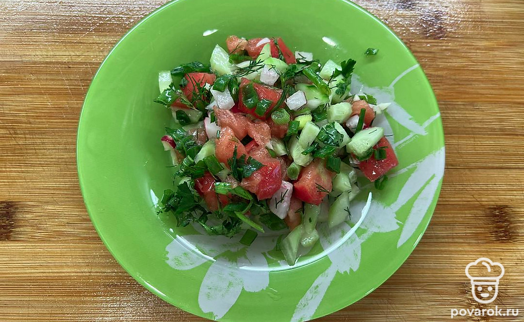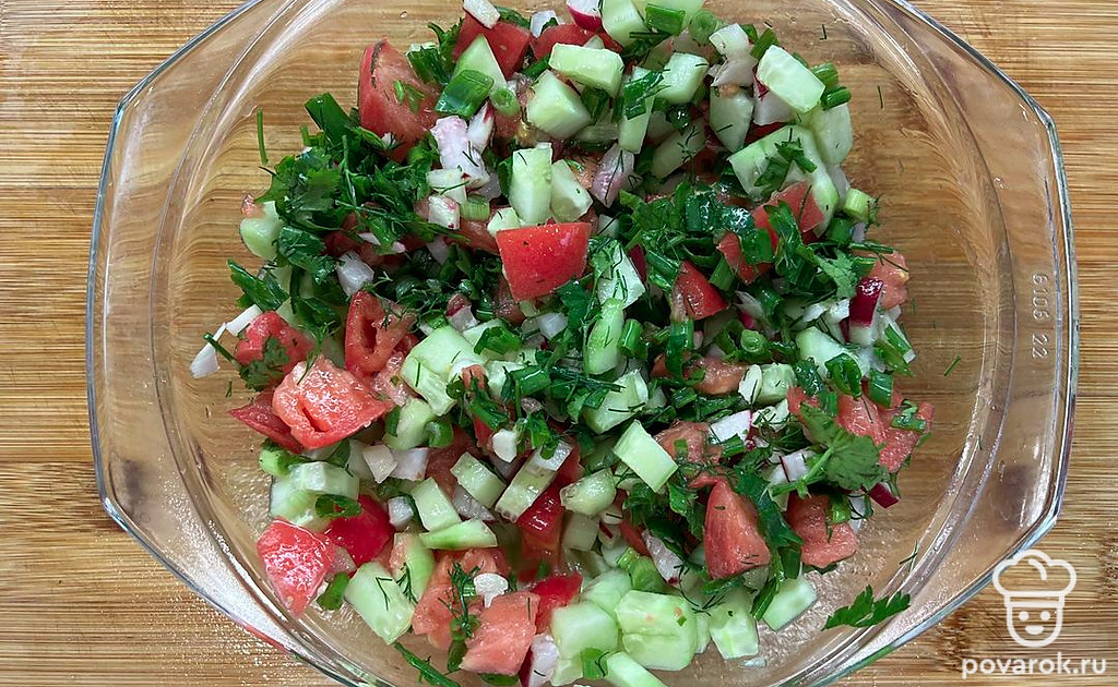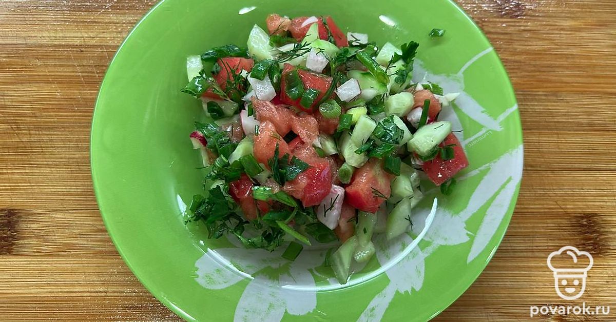 Очень полезный салат из свежих овощей, а пряный вкус ему придают травы и чеснок.