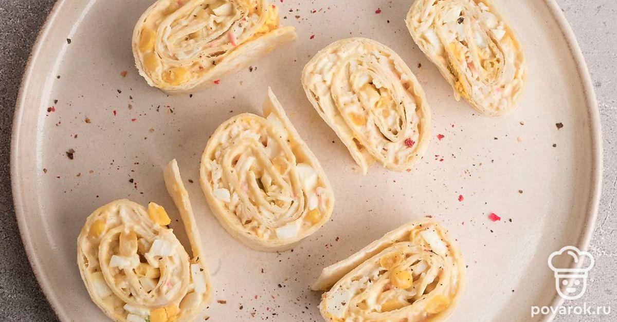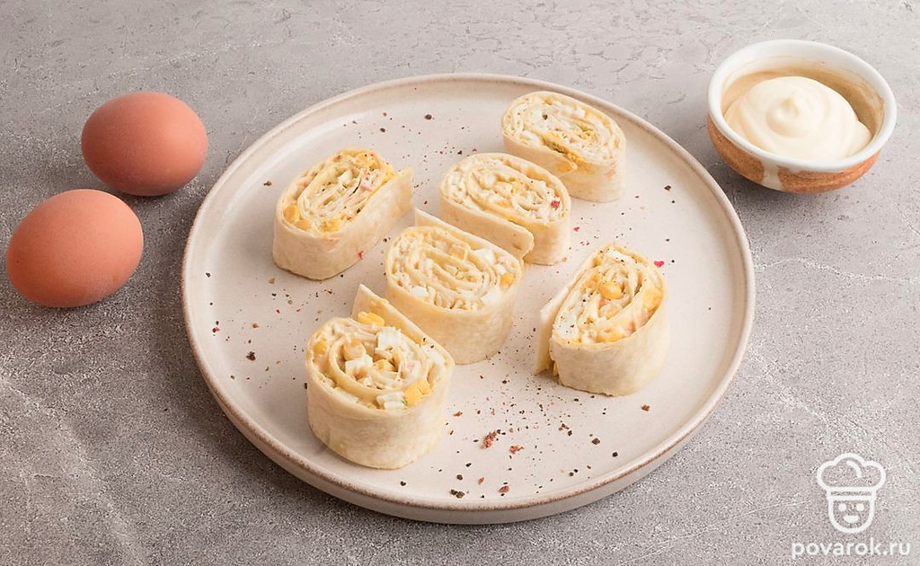 Лаваш с яйцами, крабовыми палочками и кукурузой выложите на тарелку и украсьте на свой вкус. Приятного аппетита!
