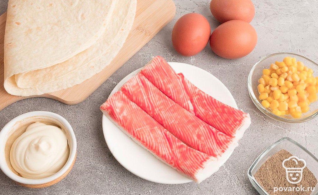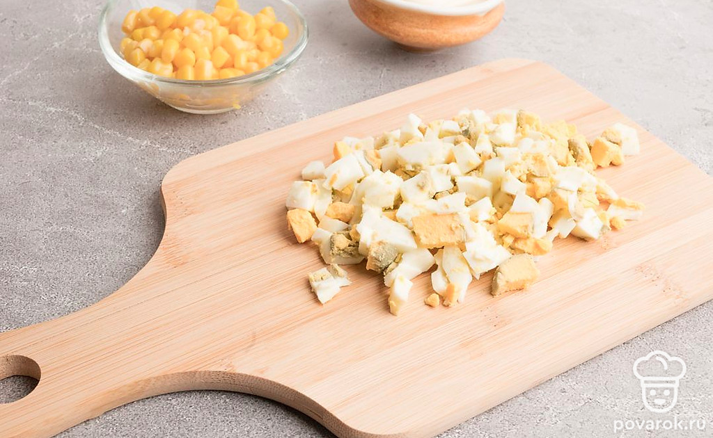Подготовьте все ингредиенты. Заранее отварите яйца и очистите крабовые палочки.