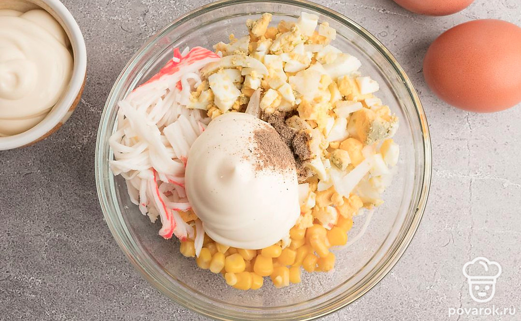Разделите крабовые палочки на полоски. В подходящую емкость выложите крабовые палочки, яйца, кукурузу. Добавьте майонез, поперчите на свой вкус и смешайте до однородности.
