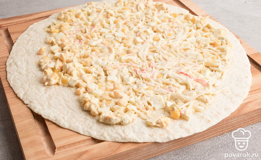 Лаваш смажьте полученной смесью, отступая от края примерно 1 см.