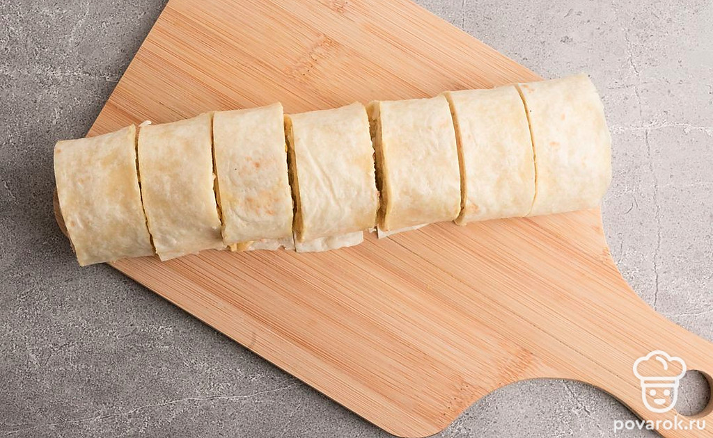 Лаваш аккуратно скатайте в рулет и разделите острым ножом на 7-8 равных частей.
