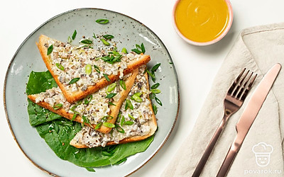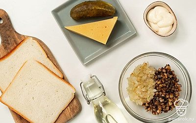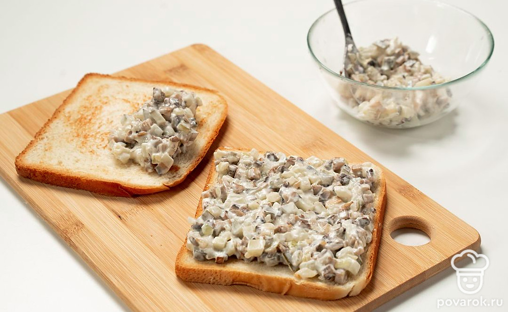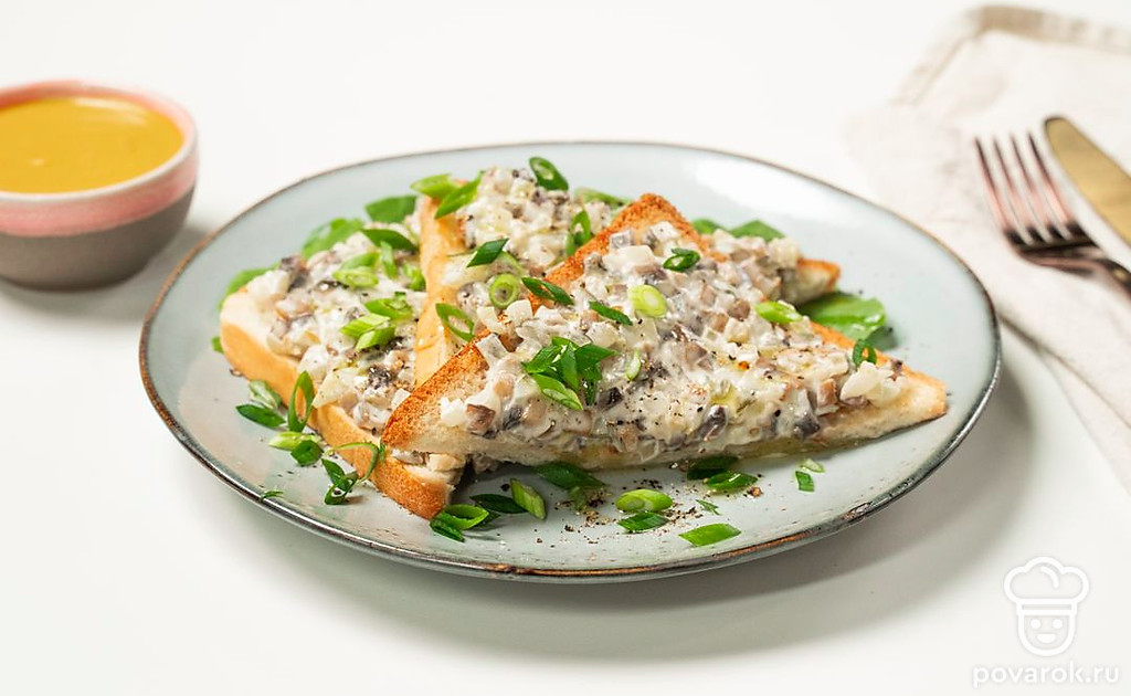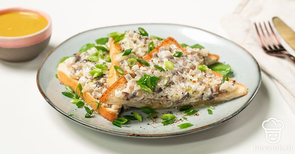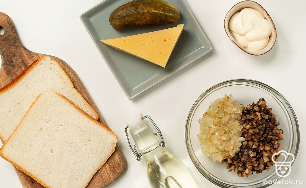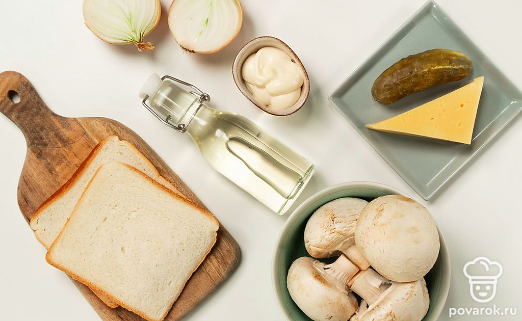 Тост с шампиньонами — сытное блюдо, которое может быть и закуской, и полноценным блюдом. Для него понадобятся грибы, лук, соленые огурцы, майонез и сыр. Эти продукты сами по себе дают интересное вкусовое сочетание, поэтому можно не добавлять приправы. Для приготовления этих тостов используются обжаренные шампиньоны, но можно заменить их на маринованные.