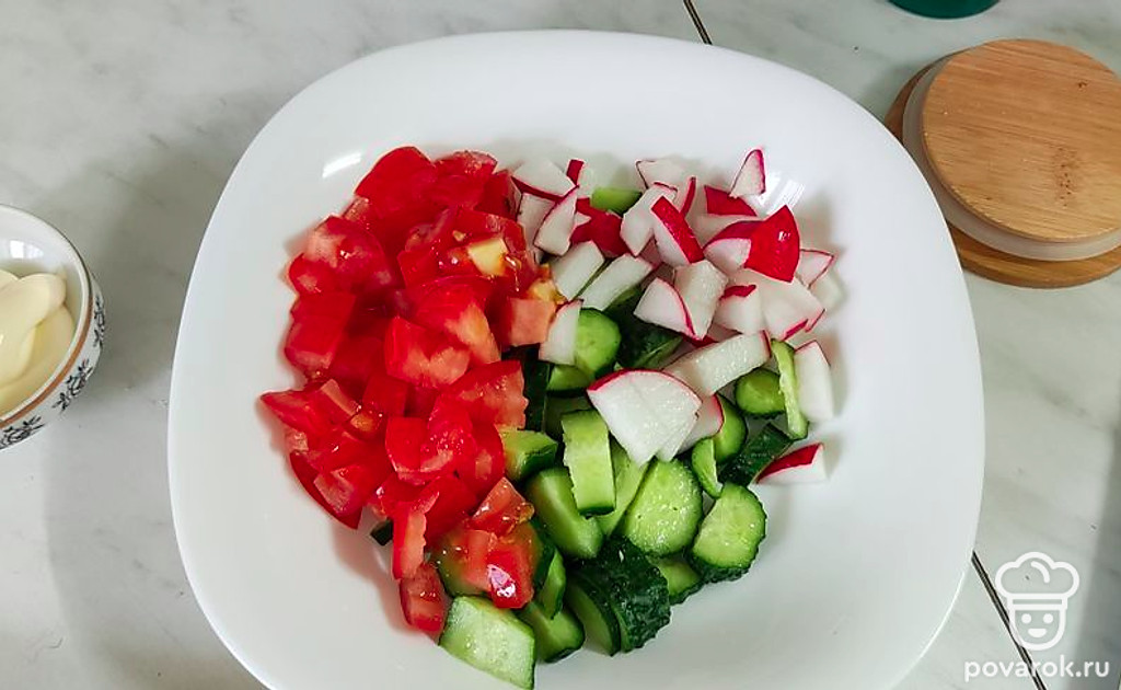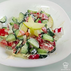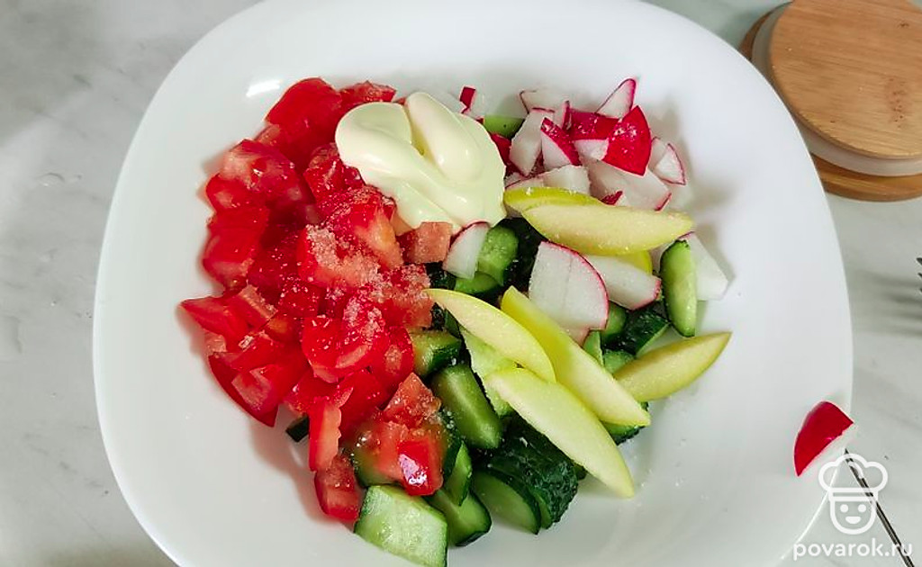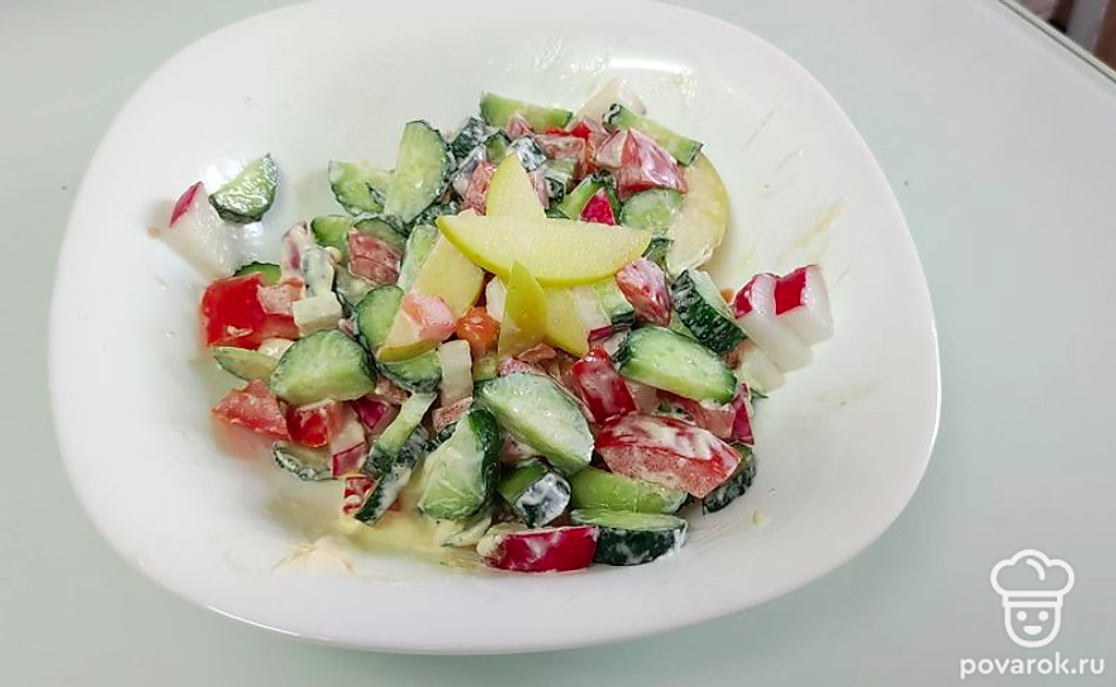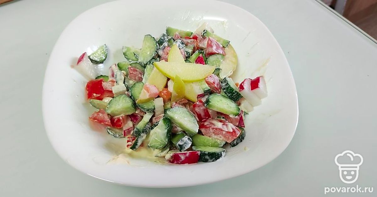 Вкусный салат из овощей и кислого зеленого яблока, заправленный майонезом.