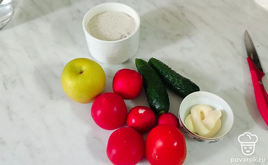 Подготовьте все необходимые ингредиенты, вымойте овощи и яблоко.
