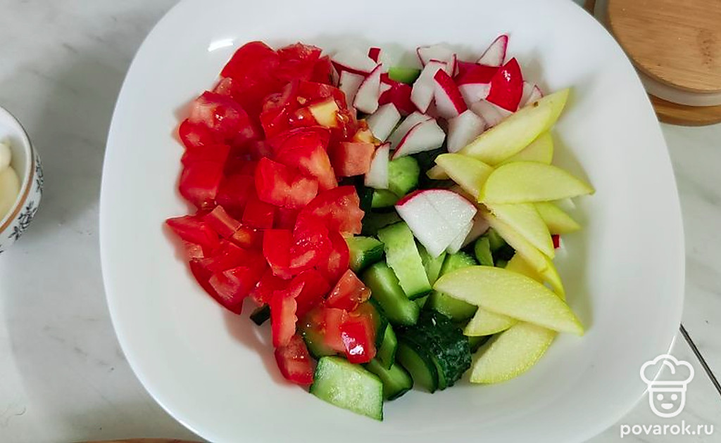 Тонкими слайсами нарежьте яблоко, добавьте к овощам.