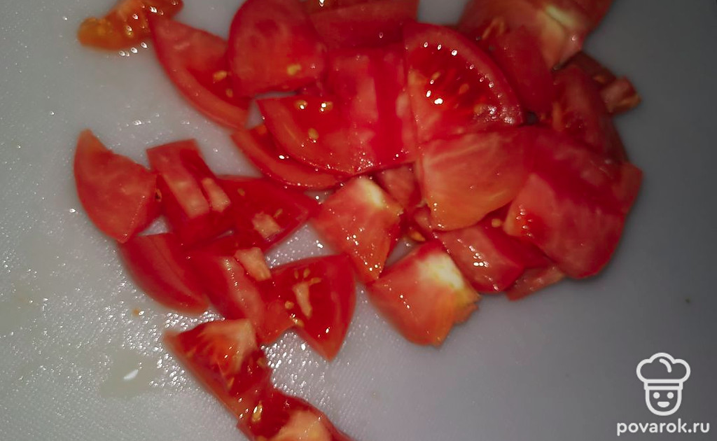Нарезаем помидор на небольшие кусочки.
