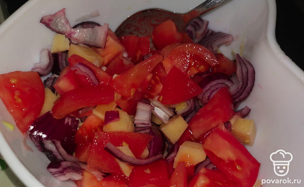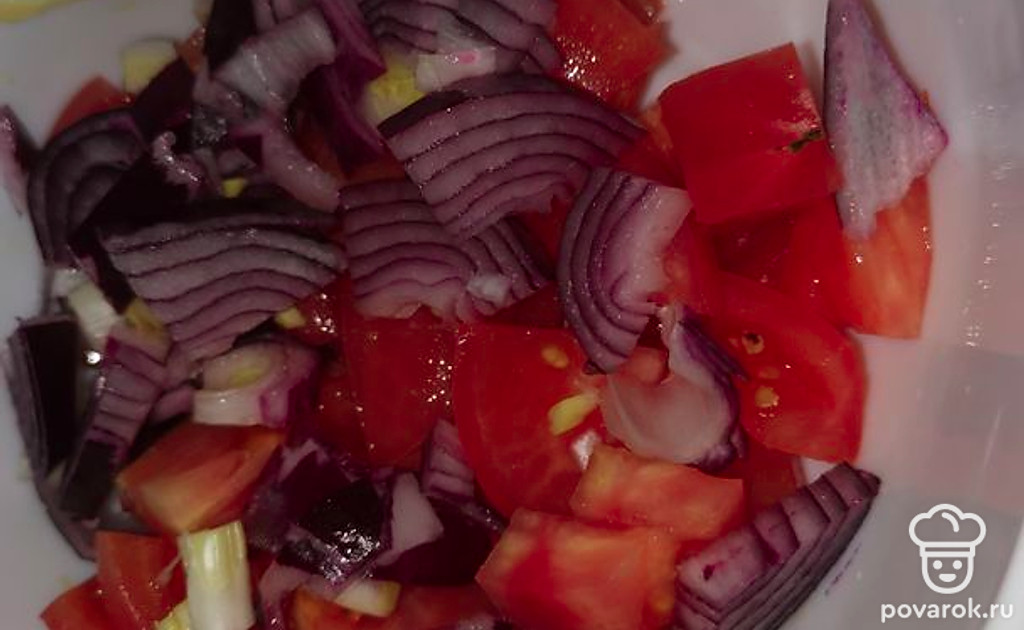 Добавим лук к помидорам.