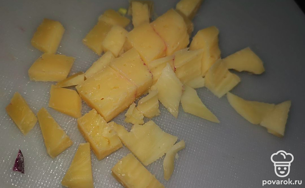 Сыр нарезаем на небольшие куски.