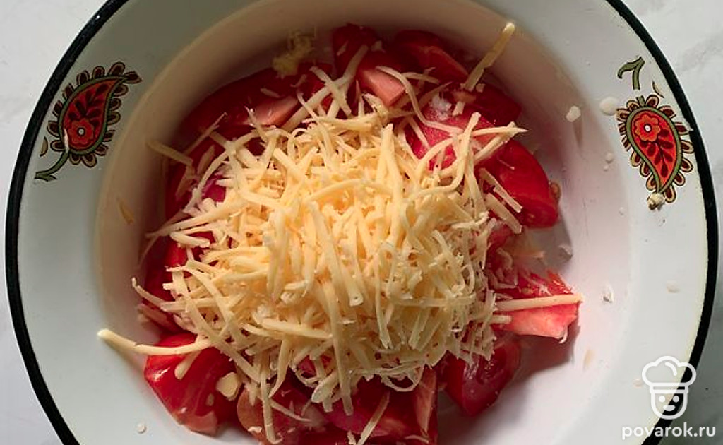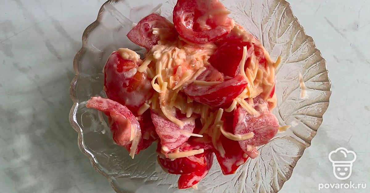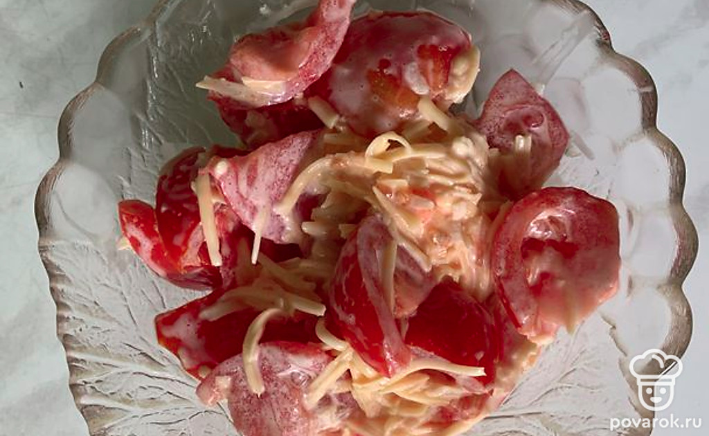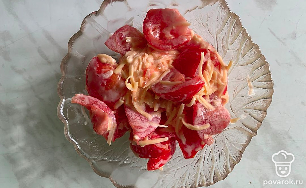 Добавить натертые на мелкой терке сыр и чеснок. Приправить майонезом напополам со сметаной. Посолить, перемешать.