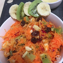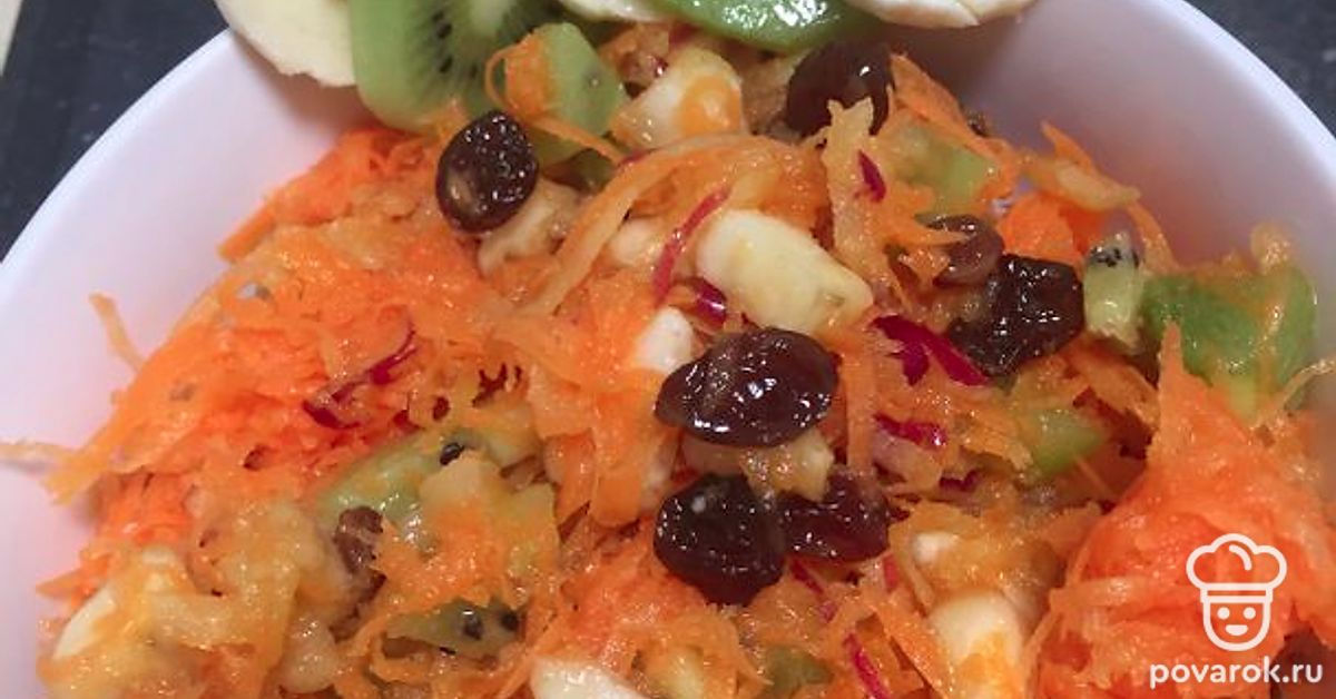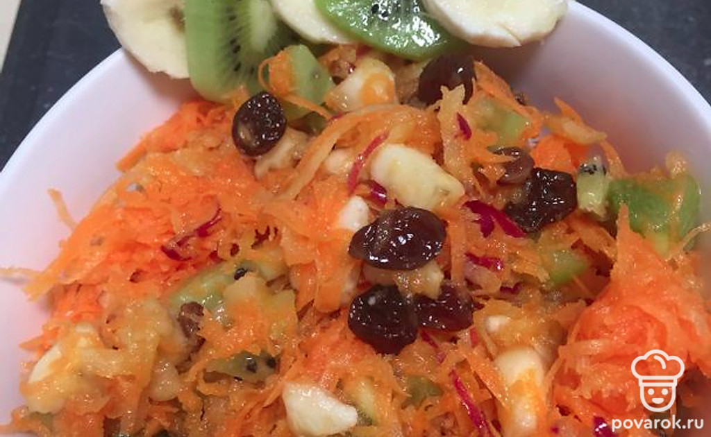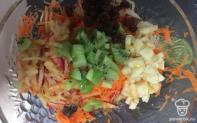 Кубиками порезать очищенный киви, банан и добавить изюм. Сверху полить оливковым маслом и перемешать. Салат готов.