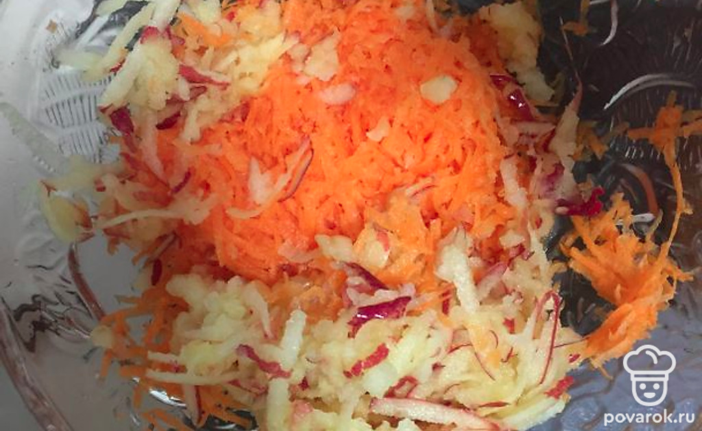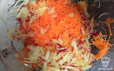 Натереть на мелкую терку морковь, на крупную натереть яблоко.