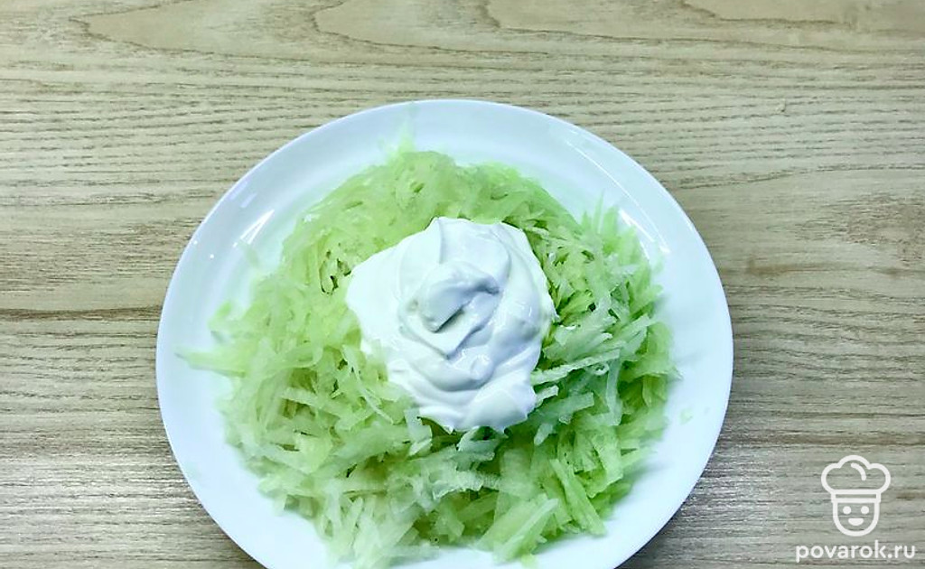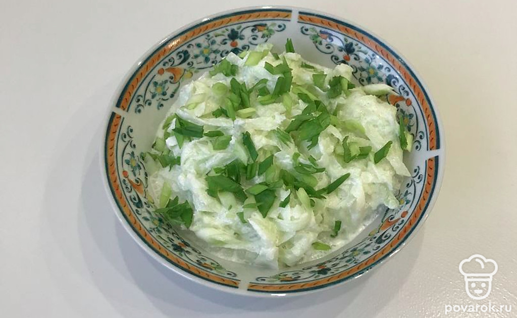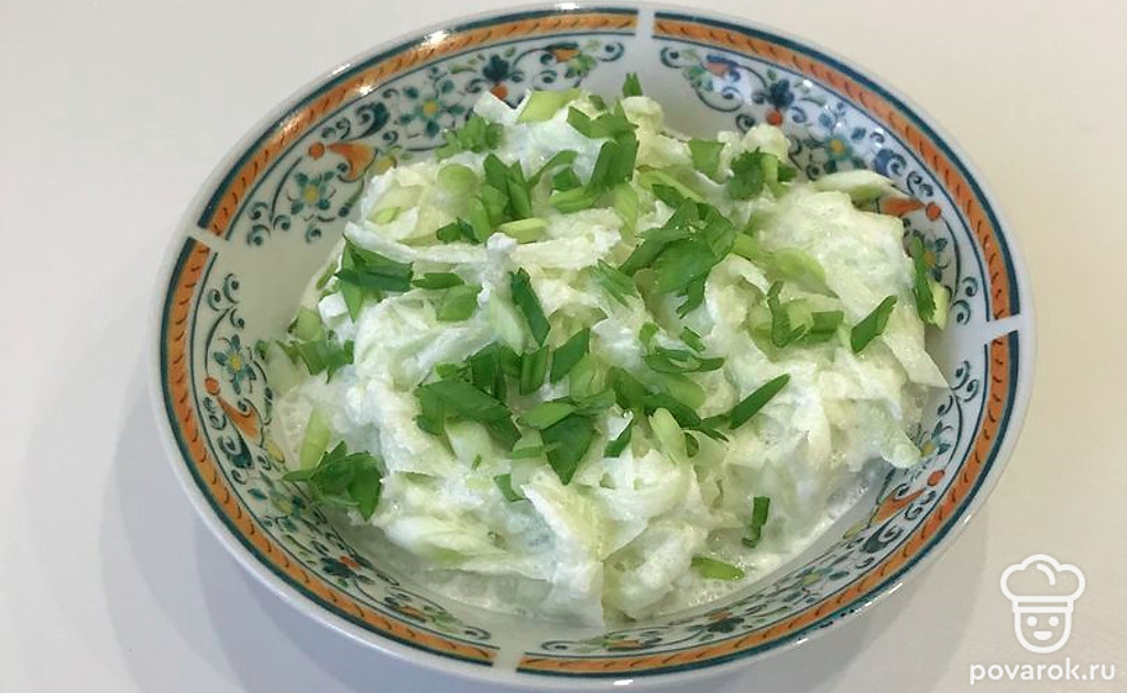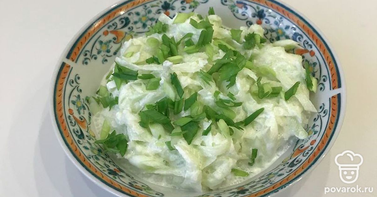 Вкусный и полезный салат с бодрящим вкусом разнообразит меню. Ингредиенты простые и привычные — сметана и зелёная редька. Особенно хорош этот салат зимой, когда организм начнёт тосковать по свежим овощам и нехватке витаминов.