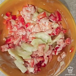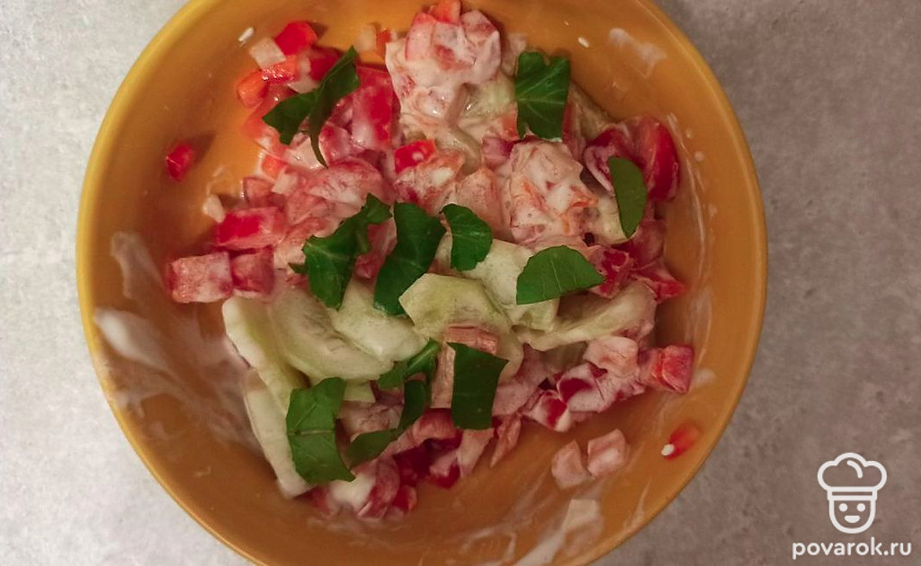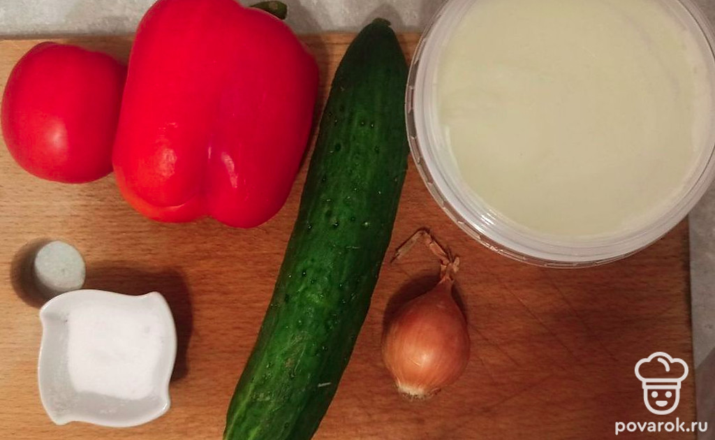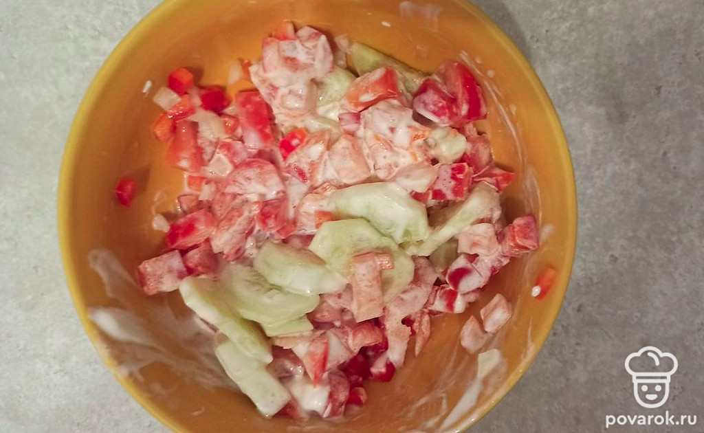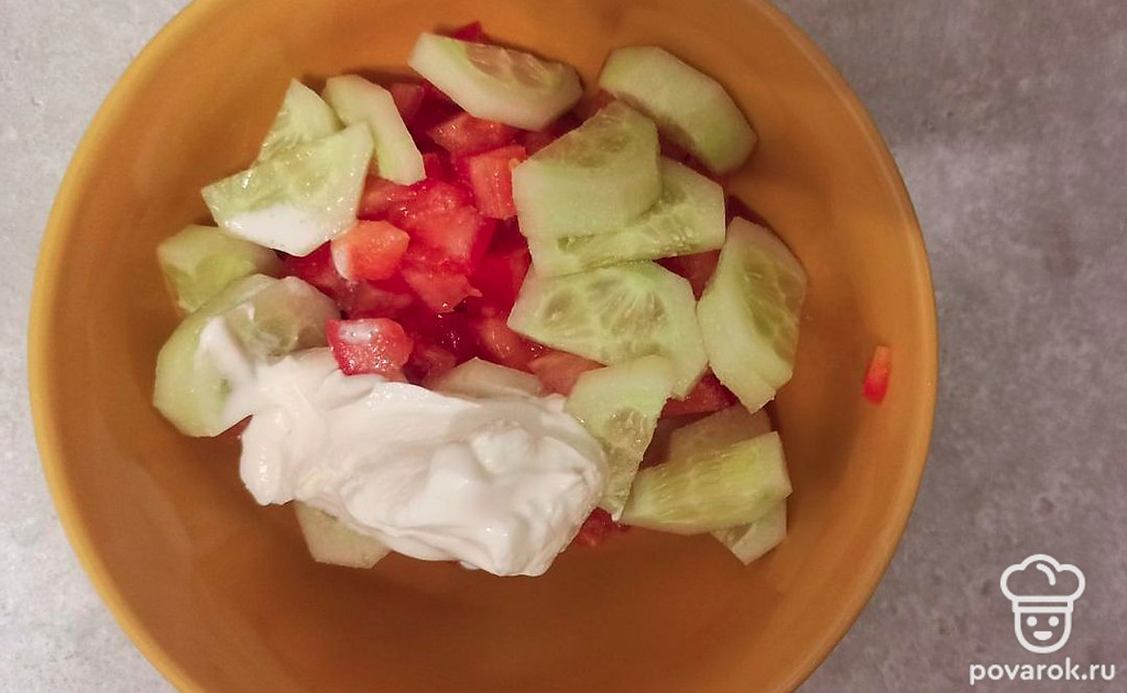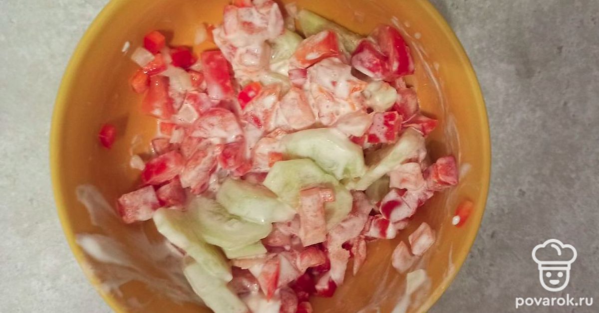Шинкуем огурец. Смешиваем овощи, добавляем соль и сметану. Перемешиваем.