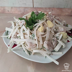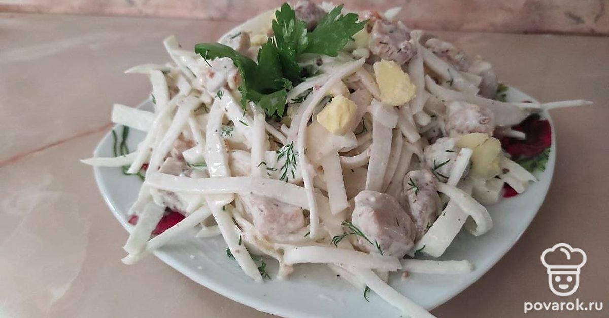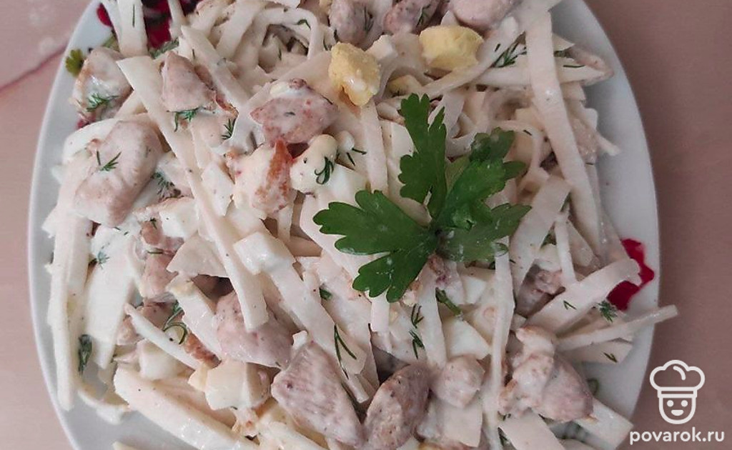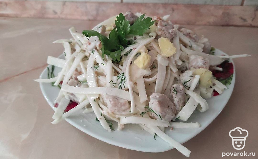 Не все любят редьку из-за ее запаха, но зря. Редька очень полезный продукт, содержащий множество витаминов. Этот продукт придает блюдам пикантную нотку. Салат по данному рецепту получается очень нежным, вкусным. Также салат получается очень сытным.