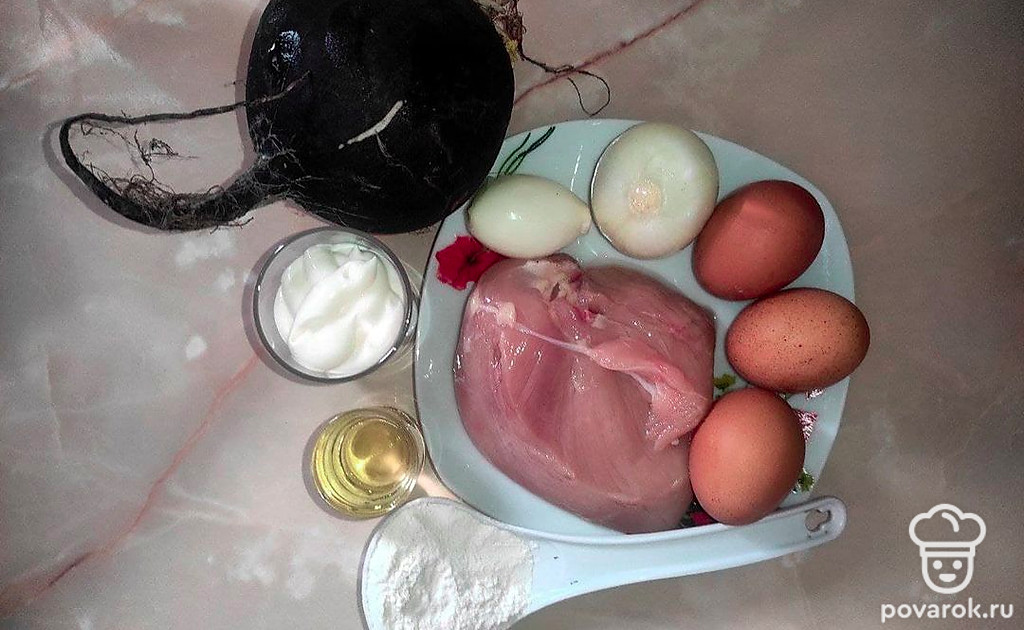 Отварите вкрутую яйца. Очистите от скорлупы. Просейте муку. Почистите лук, промойте его. Филе отчистите от пленок, если есть. Хорошо помойте мясо под водой, просушите. Редьку очистите от кожуры, также промойте.