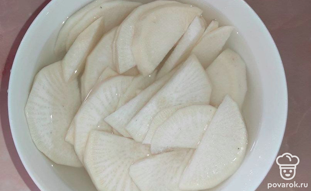 Куриное филе нарежьте небольшими кусочками. Просолите, поперчите, оставьте мариноваться. Редьку нарежьте полукольцами, залейте холодной водой, добавив немного соли, и также отложите мариноваться, примерно на 20 минут.