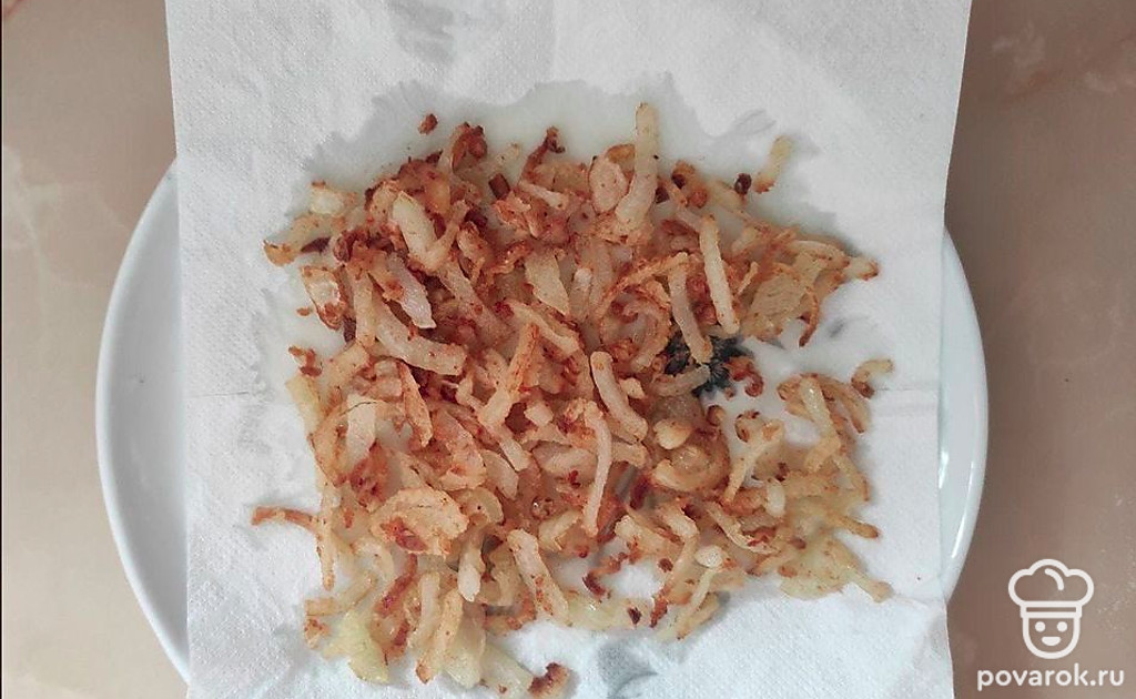 Куриное мясо обжарьте на растительном масле до готовности, чтобы она не была сухой. Лук порежьте полукольцами или кольцами, в зависимости от Ваших предпочтений. Луковые кольца или полукольца обваляйте в просеянной муке. На сковороде обжарьте лук. Обжаренный лук выложите на посуду, застеленную салфетками или бумажными полотенцами, чтобы стекли излишки масла.