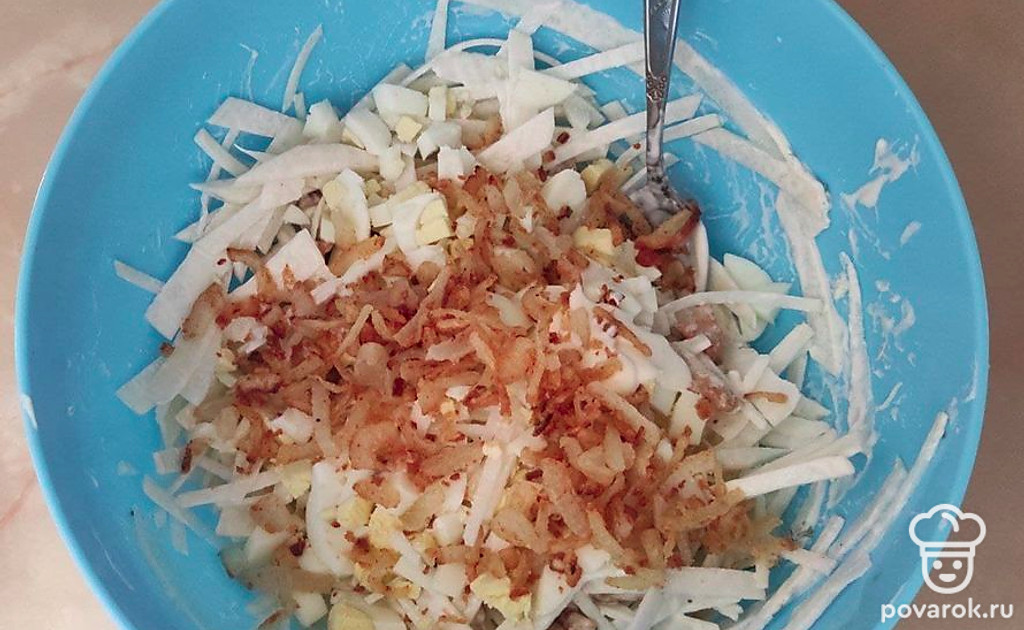 По истечении 20-30 минут маринования нарезанных кусочков редки в подсоленной воде, промойте редьку, нарежьте тонкой соломкой. В отдельную посуду, где панируете замешивать салат, поместите нарезанную редьку, обжаренную куриную грудку, измельченное яйцо, обжаренный лук и майонез. Хорошо все перемешайте.
