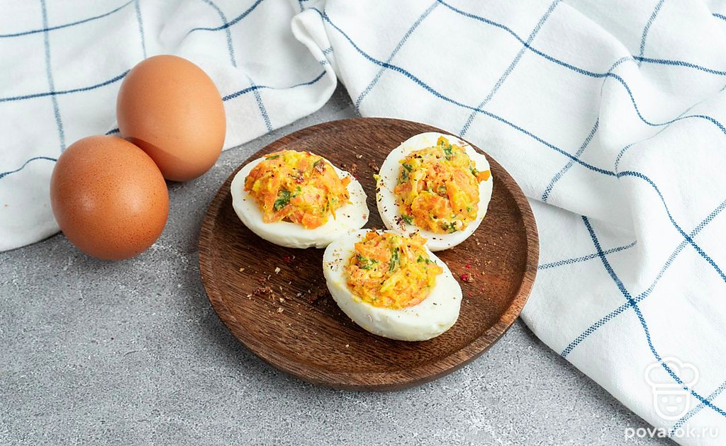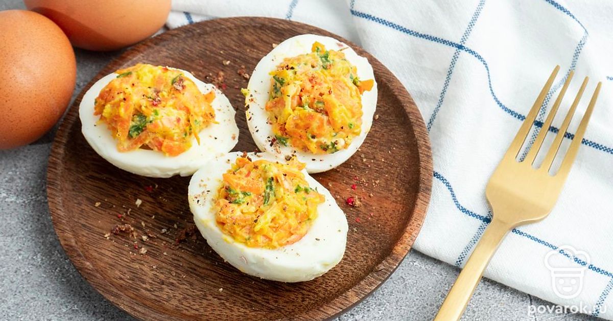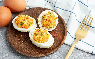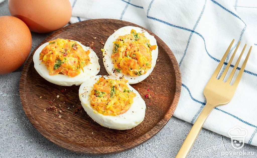 Яйца, фаршированные морковью — в первую очередь, очень полезная закуска. В ее составе — впечатляющий комплекс ценных элементов, полезных для пищеварения, нервной системы и иммунитета. Для приготовления закуски с морковью отдайте предпочтение небольшим корнеплодам. Считается, что, если морковь весит менее 150 г, вкусовые характеристики ее выражены наилучшим образом.