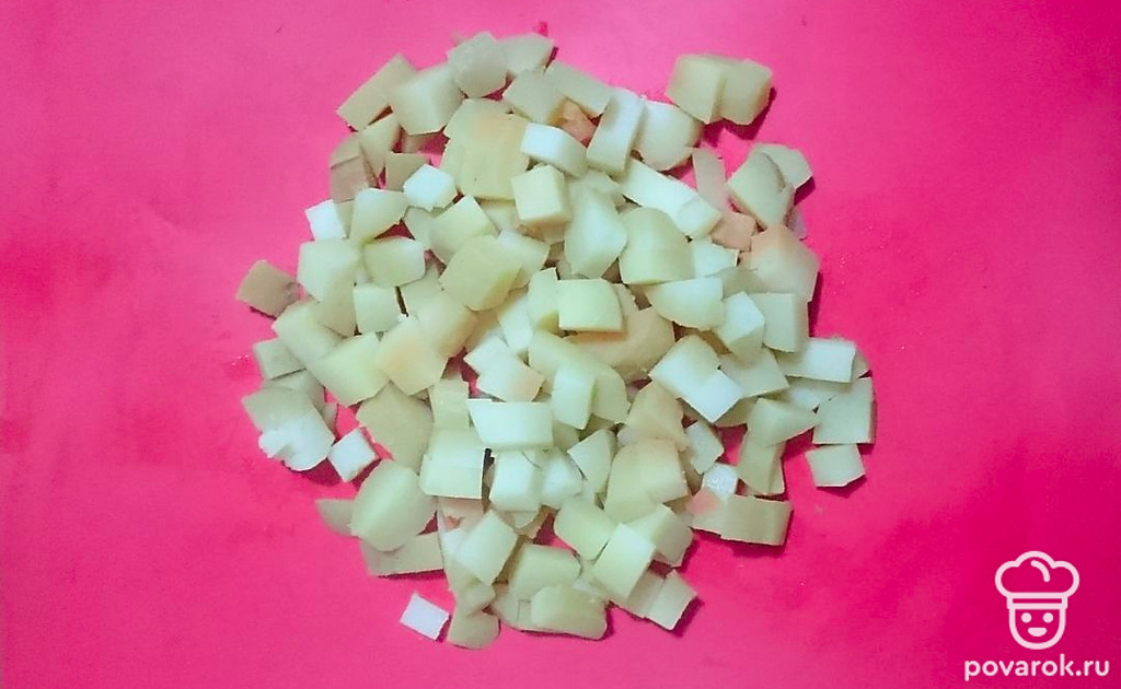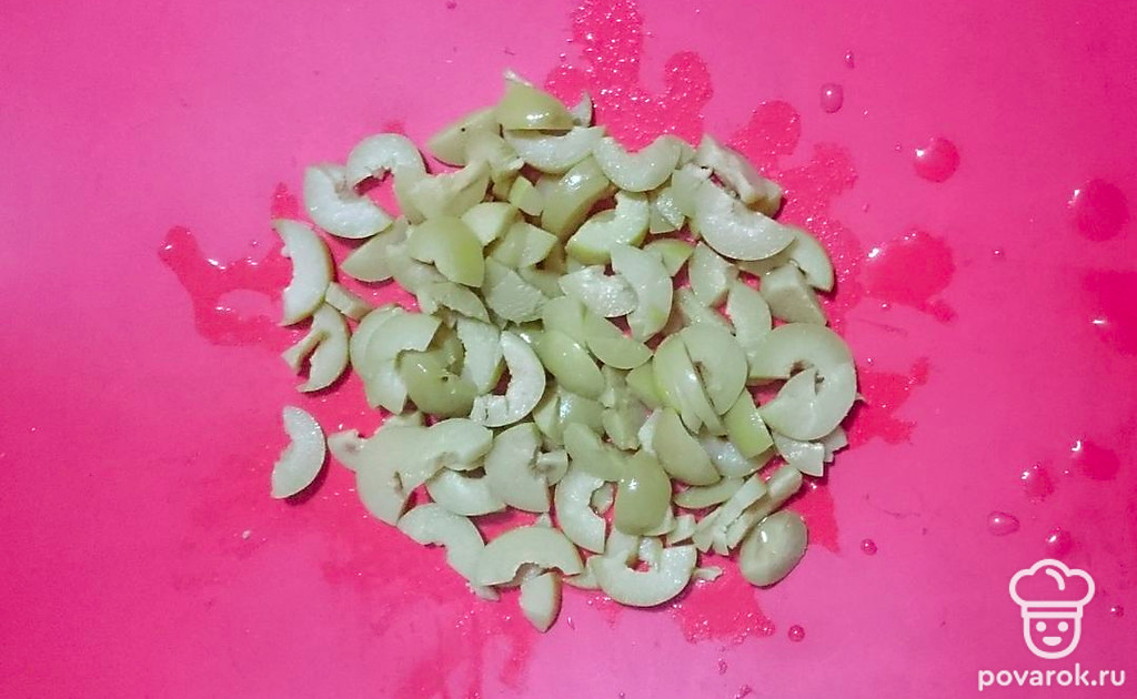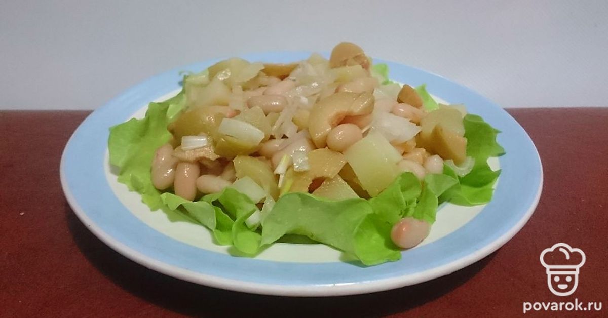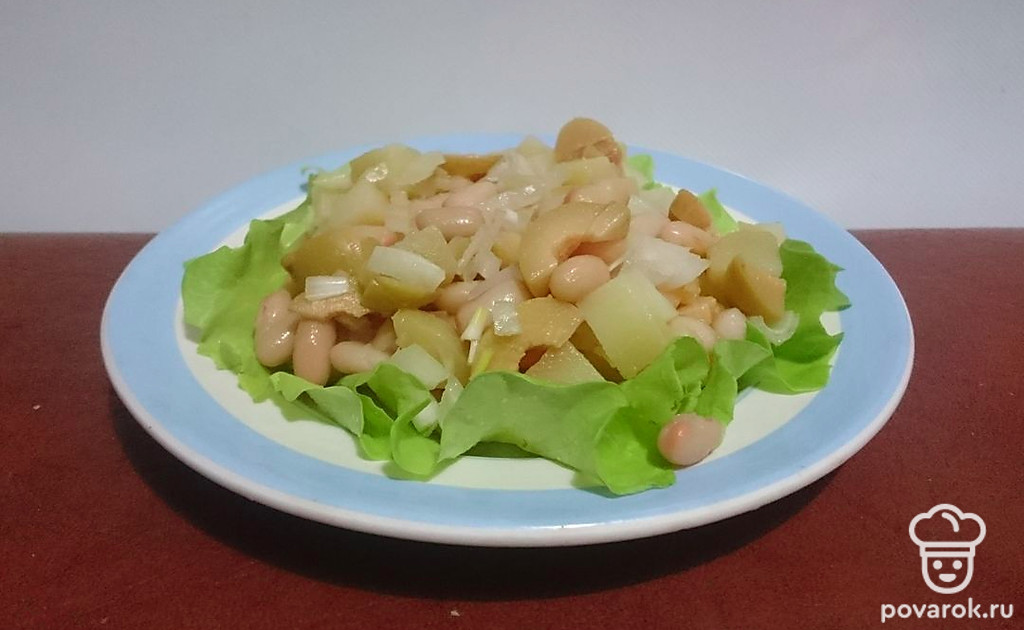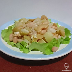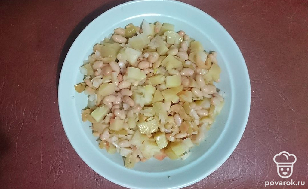 В емкость переложить картофель, лук репчатый, оливки зеленые, консервированную фасоль и добавить оливковое масло. Все перемешать. Оставить на 30 минут, чтобы все ингредиенты пропитались.