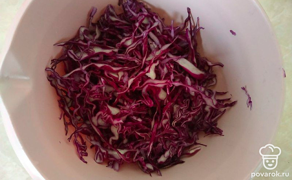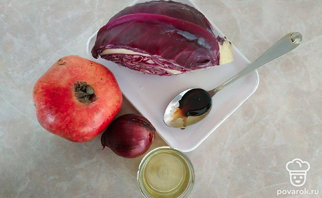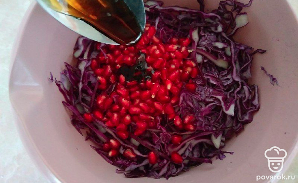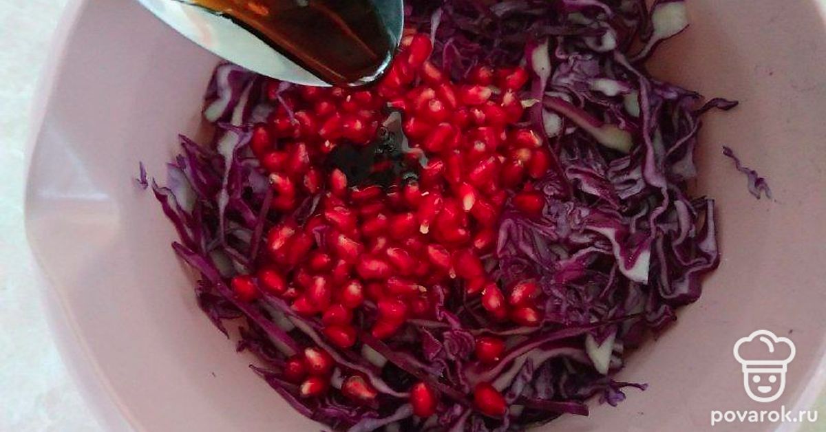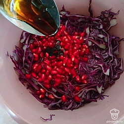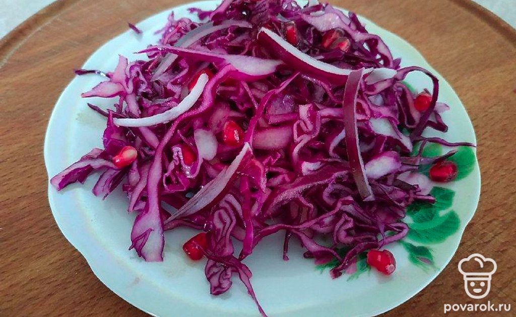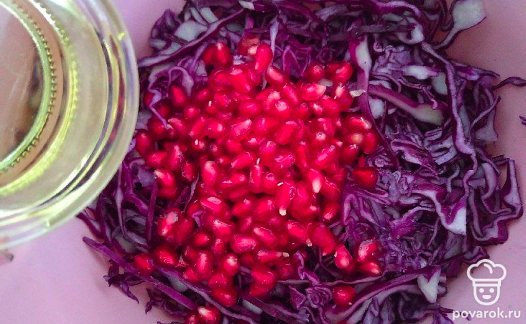 В этом салате овощи подобраны по цвету, текстуре, поэтому он получается насыщенным, сочным. Фиолетовый цвет, который преобладает в краснокочанной капусте, луке и рубиновый ― в гранатовых зернах, играет далеко не последнюю роль. Именно эта окраска плодов говорит о присутствии в них антоцианов, или антиоксидантов ― веществ, которые противостоят воспалению, образованию тромбов и укрепляют мелкие сосуды, зрение. Такой салат ― находка для всех и особенно для веганского, здорового питания и низкокалорийных диет.