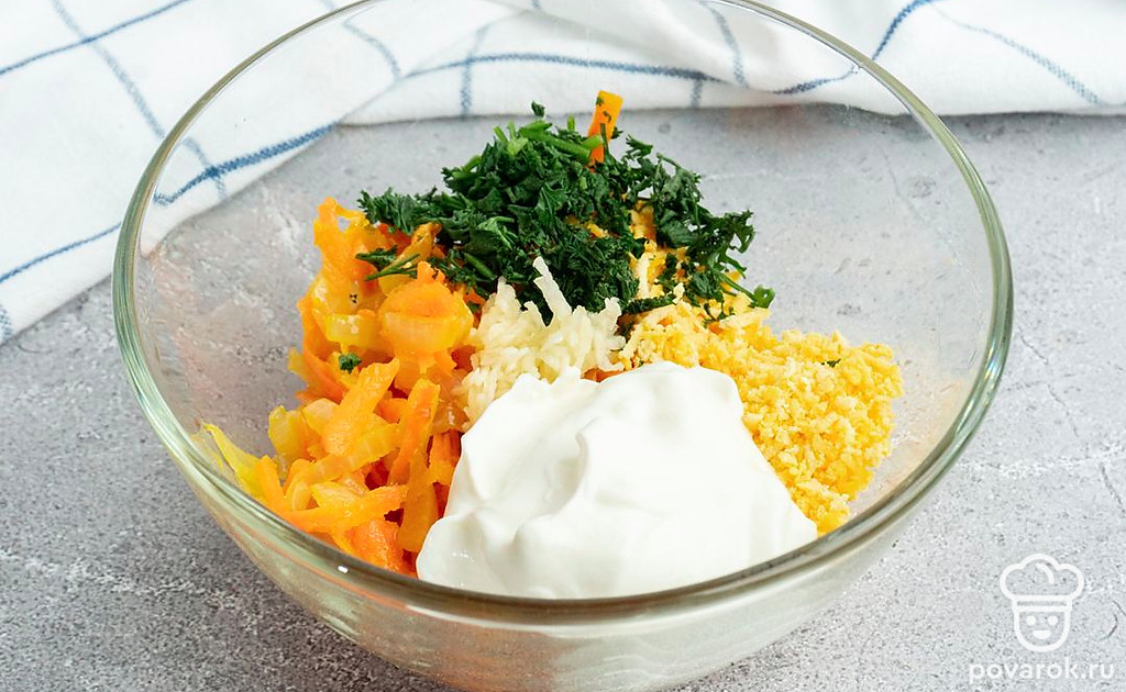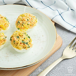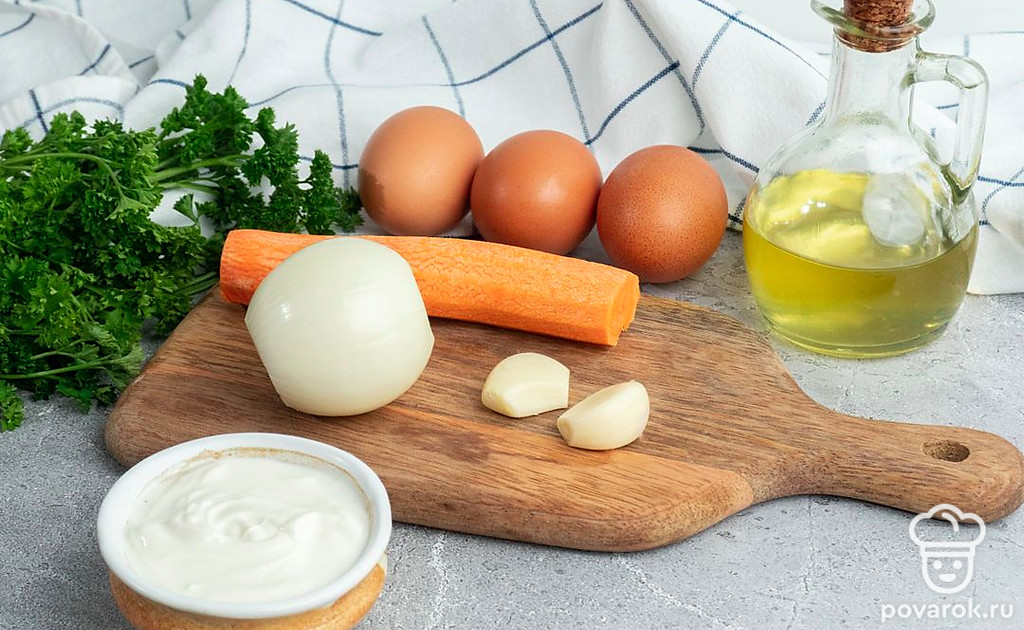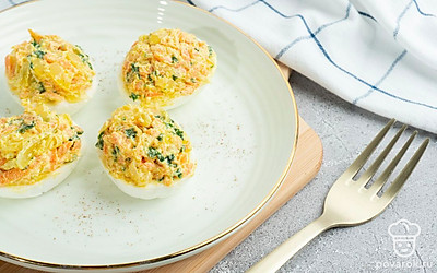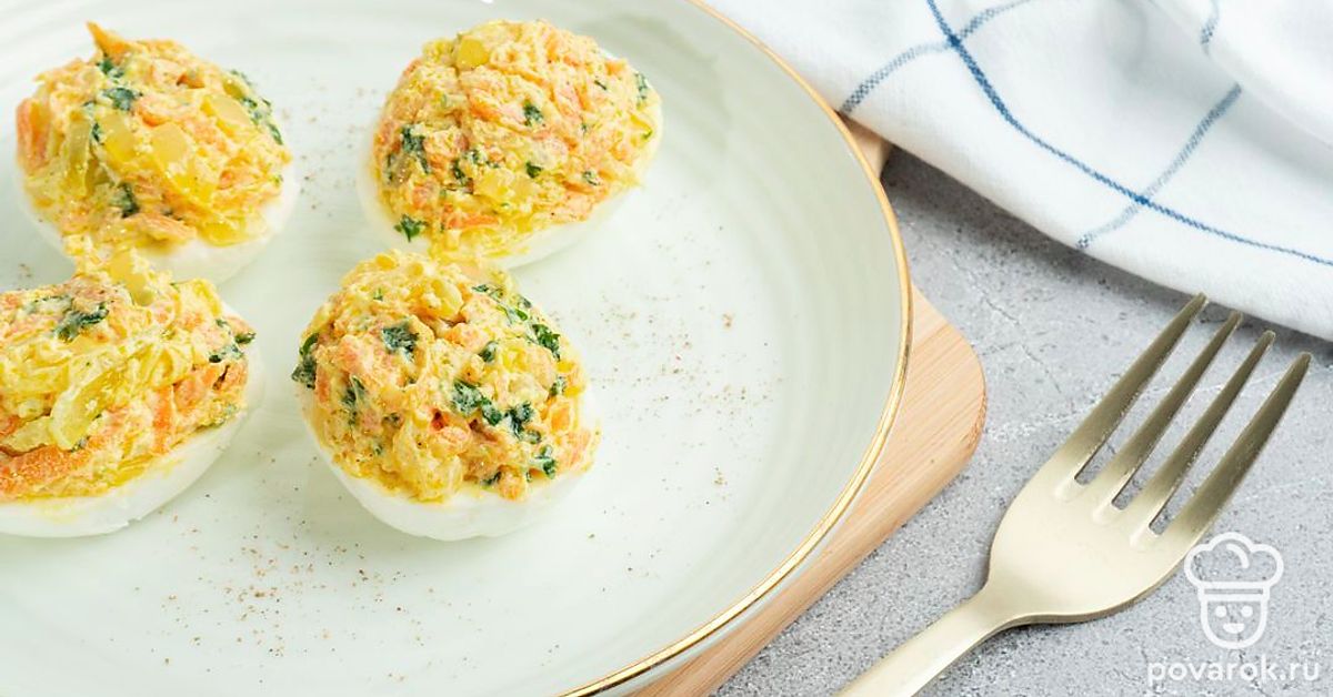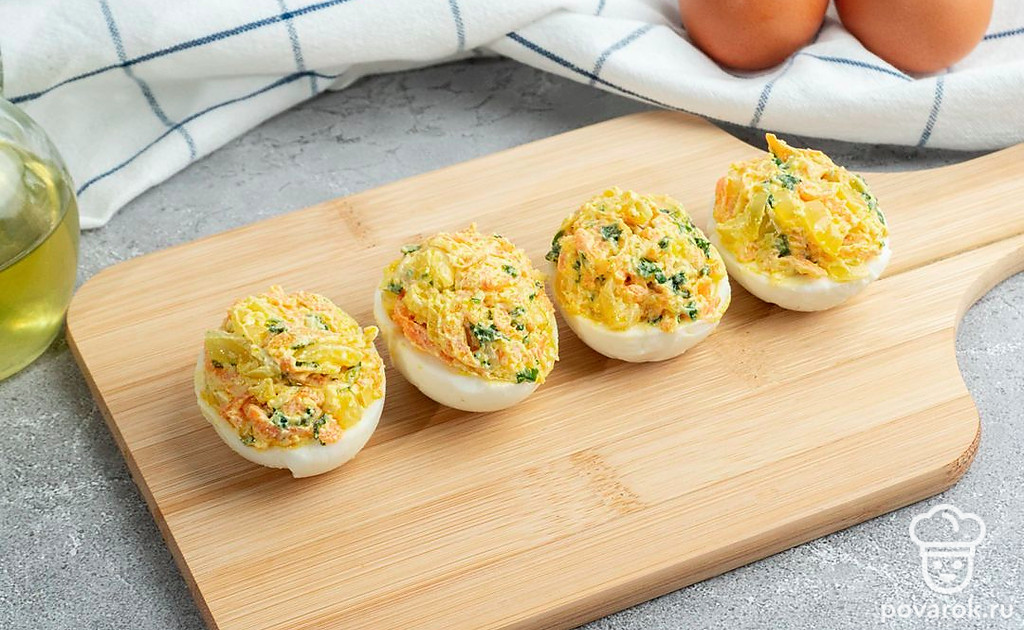 Это очень красивая и вкусная закуска — яйца, фаршированные жареным луком, морковью и майонезом, несмотря на то, что ингредиенты для нее нужны самые простые, и готовится она очень легко. Связующим звеном является майонез, придающий начинке нежную консистенцию.
