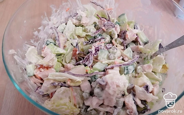 Заправить салат. При желании посолить и поперчить.