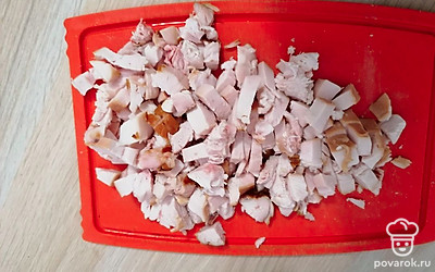 Половину куриной грудки нарезать кубиком или разобрать на волокна.