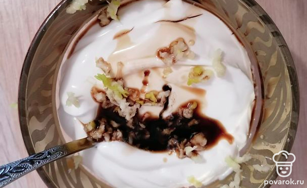 Для заправки смешать майонез, выдавленный чеснок и соевый соус.