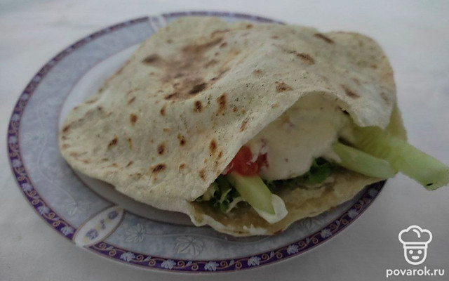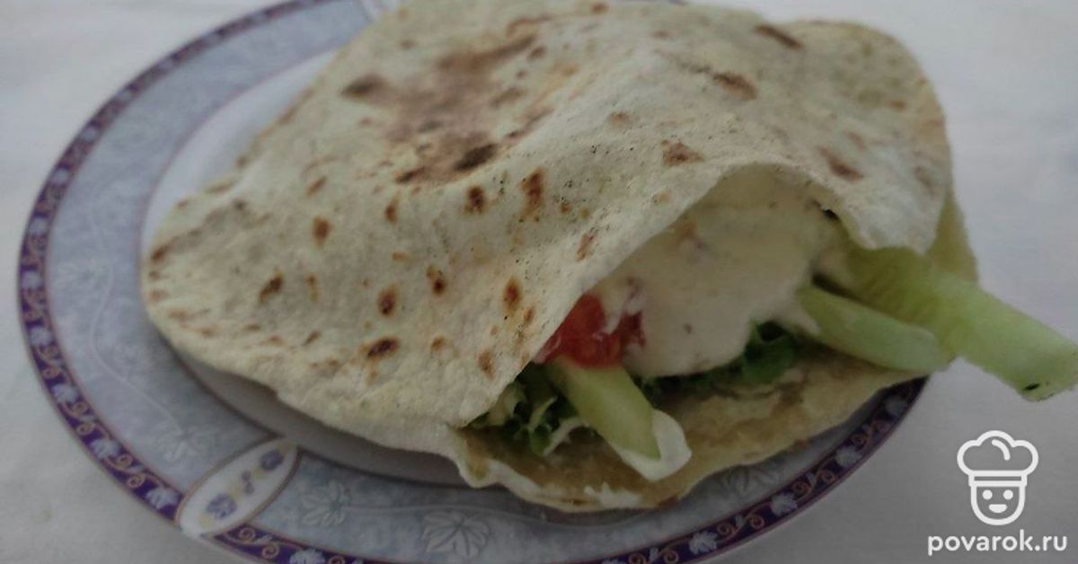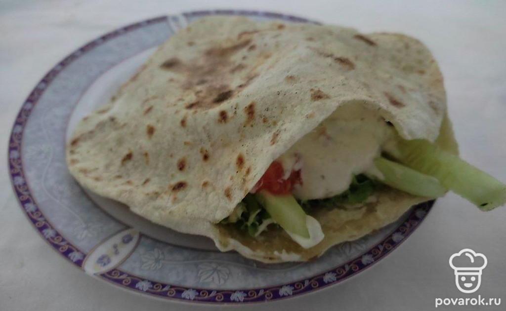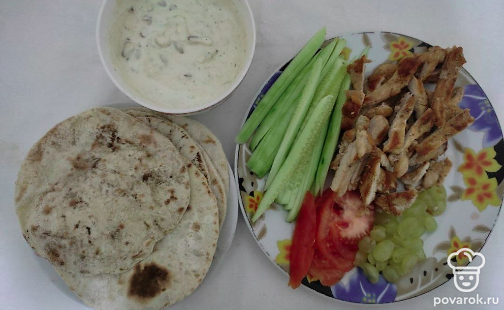 Обжарьте каждый пласт на сухой сковороде с двух сторон до набухания. Разрежьте питу не до конца пополам. Овощи и виноград нарежьте дольками и сложите все ингредиенты в полученный карман питы. Залейте готовым соусом.