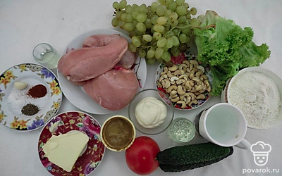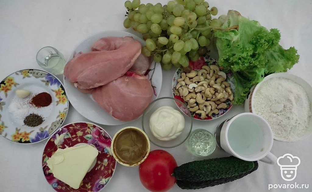 Промойте под проточной водой виноград, куриное филе, овощи. Заранее достаньте все ингредиенты, чтобы ничего не забыть добавить в процессе готовки.