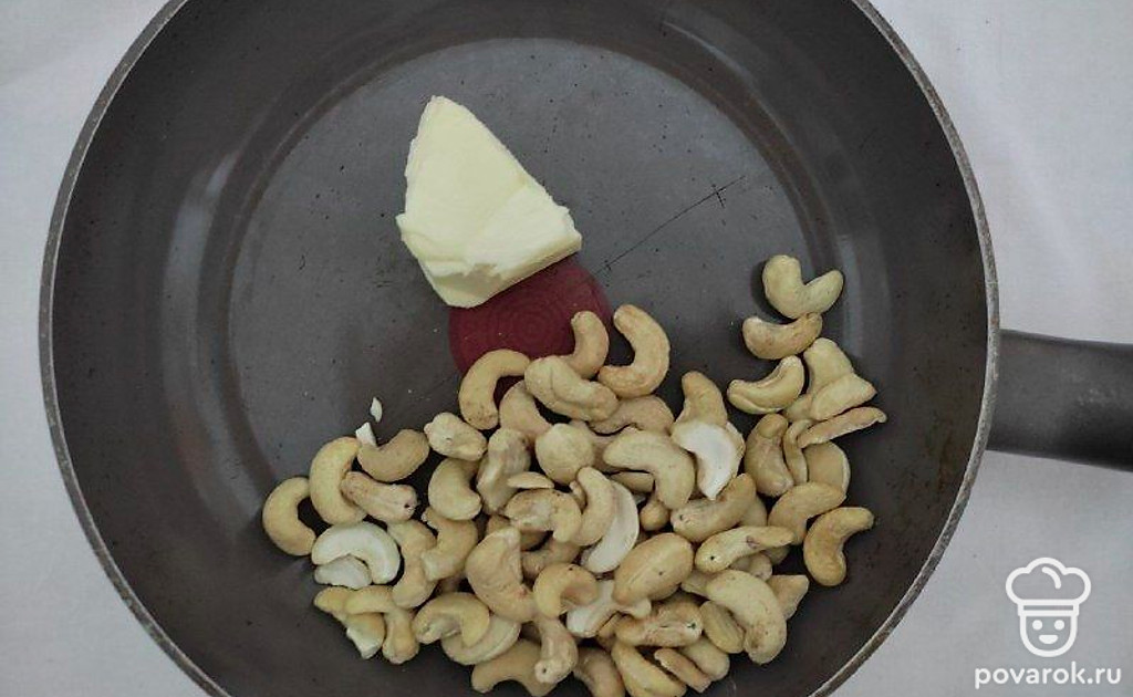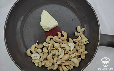 Обжарьте кешью со сливочным маслом на сковороде примерно 5-7 минут до золотистости. Оставьте остывать.