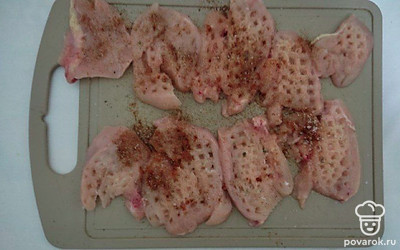 Разрежьте куриное филе на доли, отбейте, посыпьте с обеих сторон паприкой, черным перцем и солью.